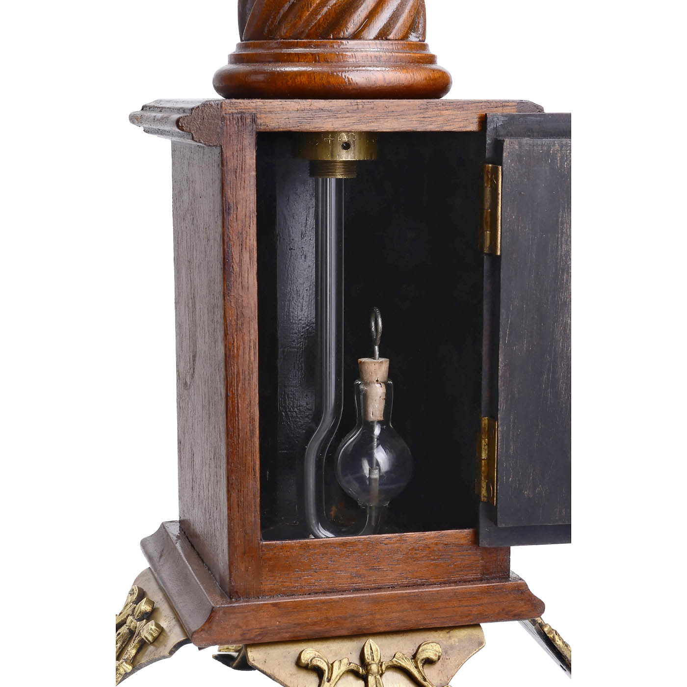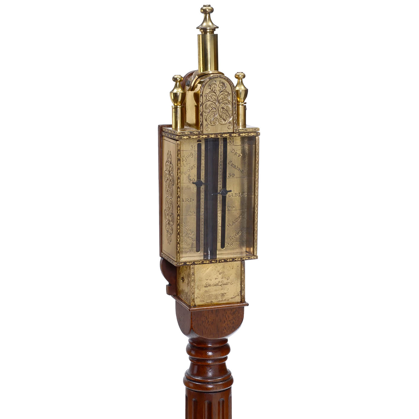 Rectangular gilt-brass hood with three turned finials and engraved sides, 2 brass register dials behind the beveled glass front, two sliding register pointers, adjustable via knobs on the top, small brass front plate engraved "Daniel Quare", walnut base consisting of a rectangular cistern cover with opening door to the front under a twisted pillar and a fluted reed pillar with brass rods in the lower section, on 4 hinged brass feet with attached leaf ornaments, interior with the large glass pillar with mercury container at the bottom, overall height 40 in. Shipping possible, no mercury filling! - Daniel Quare was an English watch and clockmaker to George I and one of the two primary makers of barometers. - This is a finely crafted replica, with first rate carvings and engravings, a tribute to the 18th century original.