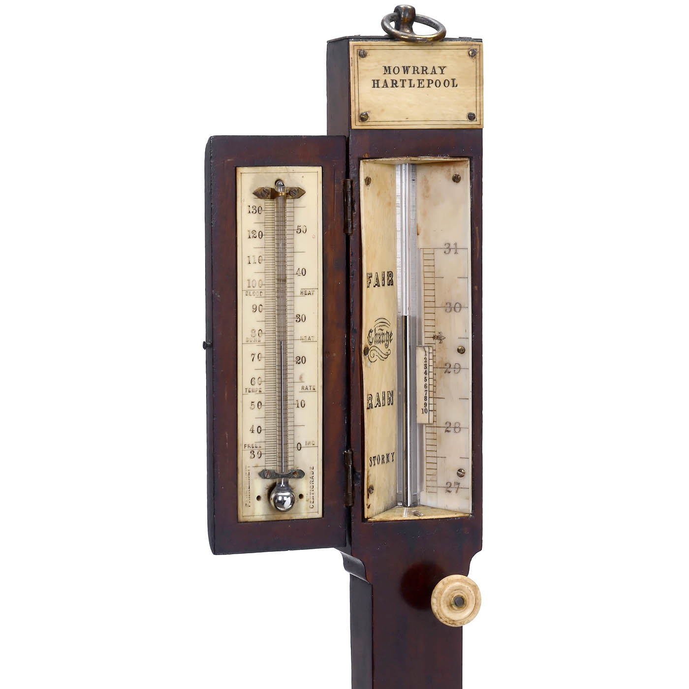 England. Nautical mercury barometer, signed: "Mowrray Hartlepool", bone scales and vernier, mahogany body, brass mercury container, hinged door with thermometer calibrated in Fahrenheit and Celsius, height 37 in., later gimbal mount. - No shipping because of the mercury.