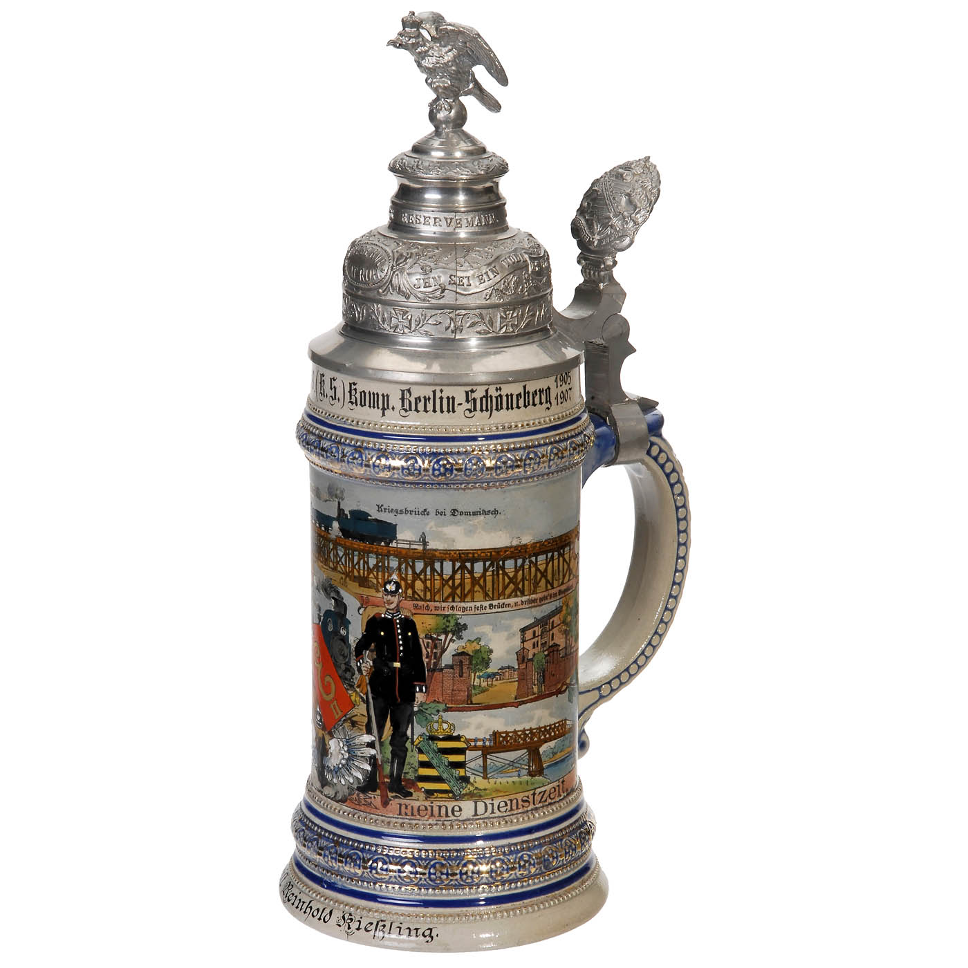 Eisenbahn-Regiment Nr. II, 8. (K.S.) Komp. Berlin-Schöneberg, made by Merkelbach & Wick, Grenzhausen. ½-liter stoneware jug for reservist Reinhold Kießling, 1906-1907. Chromolithographed and hand-painted decoration, various depictions including the Dommitzsch war bridge, with name list. High tin lid with relief, crowned griffin on top, thumblift with Kingdom of Saxony coat of arms, total height 11 ¼ in.