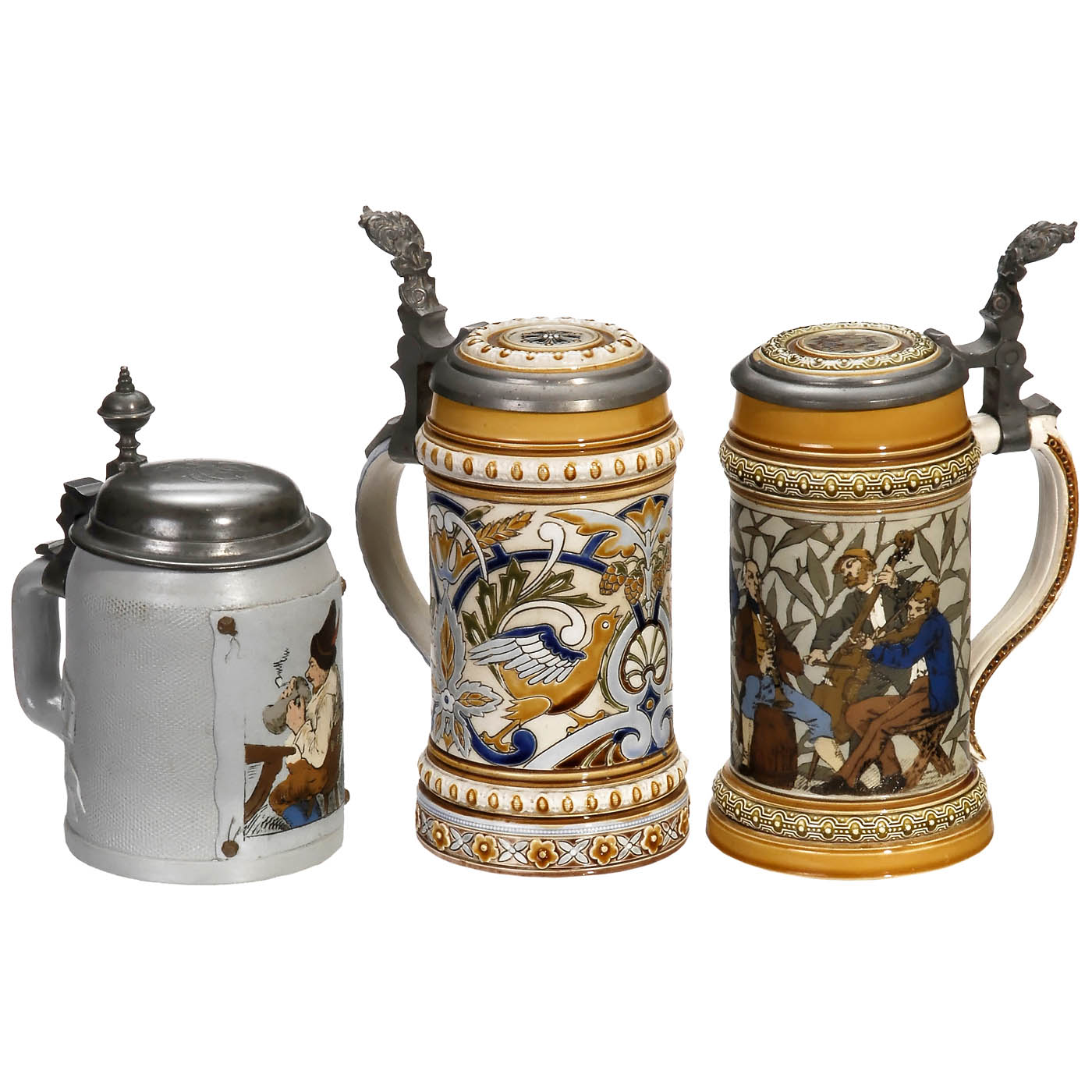 Villeroy & Boch. Bottoms with hallmark and model number. 1) No. 1163, musicians, ½ liter, etched, with inlaid tin lid. - 2) No. 1192, birds with barley and hops, ½ liter, etched, with inlaid tin lid. - 3) No. 1646, mountain dweller, ½ liter, etched (tapestry), tin lid. - And: 4) No. 6, three figures, 3 liters, relief, inlaid lid. The three figures depicting Germania, the biblical Noah and King David, with German text.