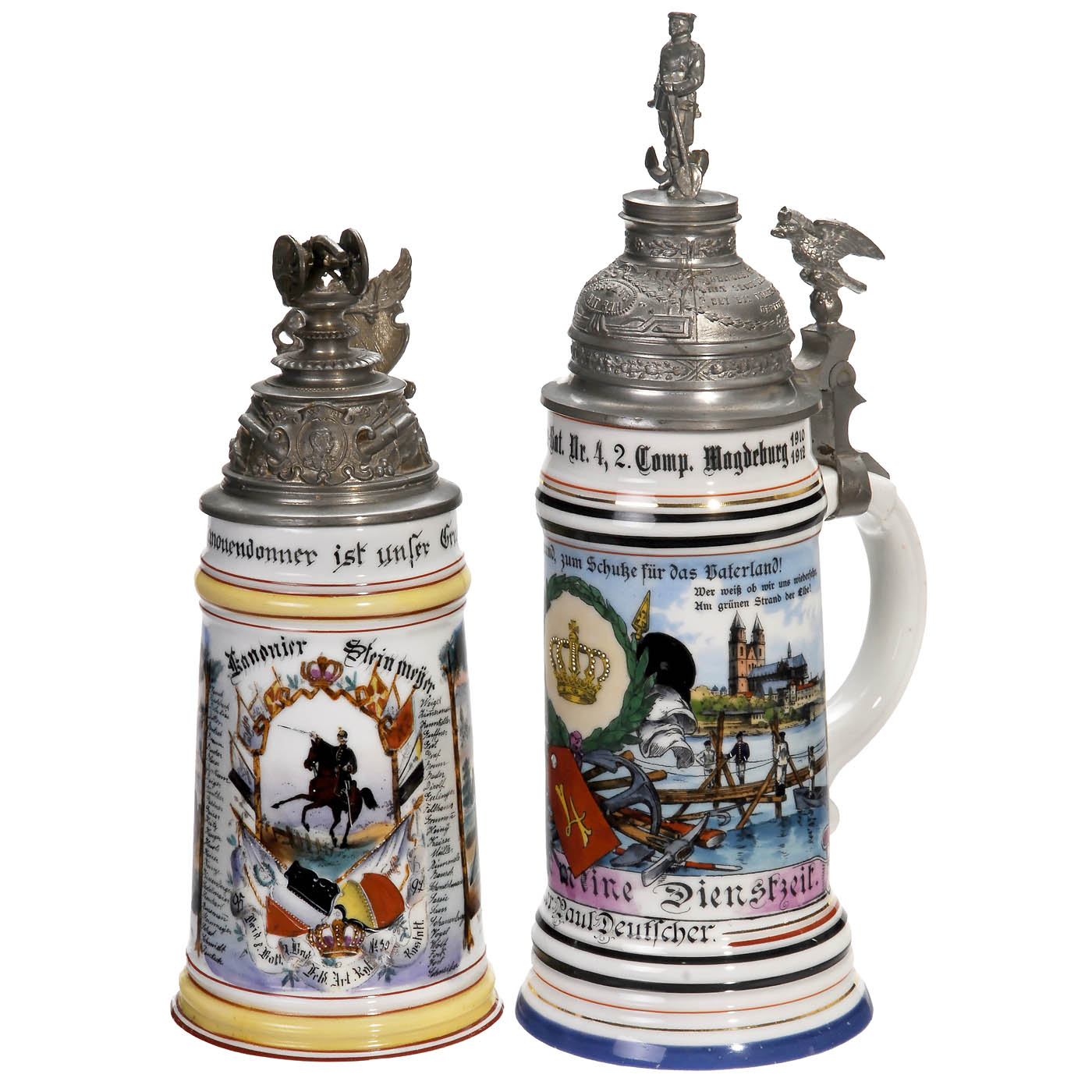 1) Baden. "8. Batt. Feld Art. Rgt. No. 30, Rastatt". ½-liter jug for the gunner Steinmeyer, 1895-1897. Lithophane base, chromolithographed and hand-painted decoration, 2 military scenes, with name list, high tin lid with relief, canon on top, Baden coat of arms with griffin thumblift, cannon slightly bent, edge with hairline crack, total height 9 ½ in. - And 2) Saxony-Anhalt, "Magdeburgisches Pionier Bat. Nr. 4, 2. Comp. Magdeburg ". ½-liter jug for the Pionier Paul Deutscher, 1909-1912. Lithophane base (farewell scene), chromolithographed and hand-painted decoration, 2 scenes, with name list, high tin lid with relief, standing soldier with anchor and shovel on top, crowned raptor thumblift, total height 12 ½ in.