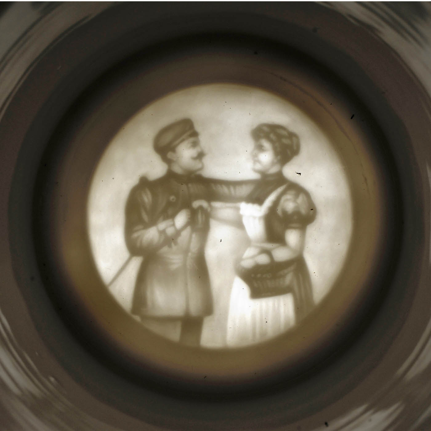 1) Bavaria. "8. Comp. 7. Bayr. Inf. Rgt. Prinz Leopold, Bayreuth". ½-liter jug for the infantryman Emil Barthel, 1911-1913. Lithophane base (farewell scene), chromolithographed and hand-painted decoration, 4 military scenes, with name list, threaded lid with relief and blue glass jewel, standing soldier with sitting lion beside him on top, Bavarian lion thumblift, total height 12 ¼ in. - And: 2) Saxony. "5. Kgl. Sächs. Inft. Regt. Kronprinz No 104/4. Comp. Chemnitz". ½-liter jug for the soldier Gulden, 1909-1911. Lithophane base (farewell scene), chromolithographed and hand-painted decoration, 4 scenes of military life and depiction of the barracks, with name list, high tin lid with relief, standing soldier with wounded comrade beside him on top, Saxon coat-of-arms thumblift, total height 12 in.