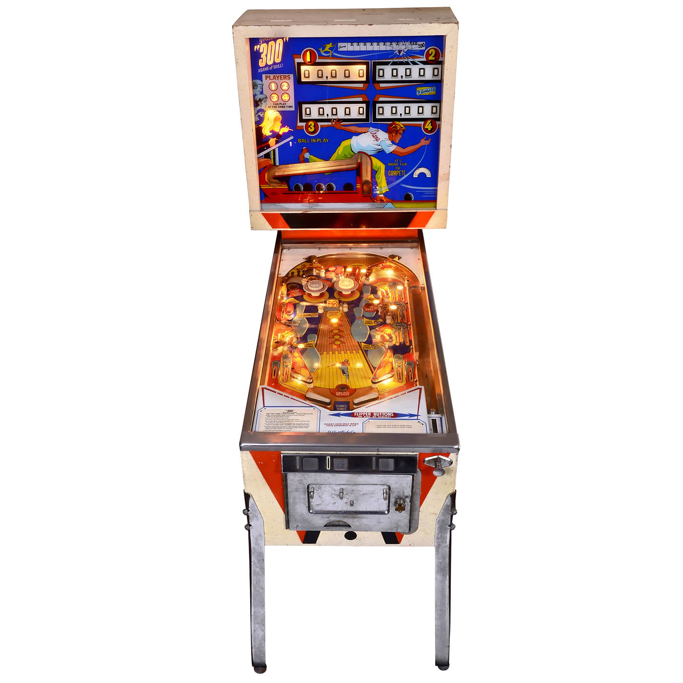 Gottlieb & Co., Chicago. 4 players, electro-mechanical, with 2 flippers, 2 pop bumpers, 4 stand-up targets, 2 kick-out holes, spinning target, ball return gate and animated backbox (bowling balls). With chimes working. Original condition, with keys. - A good playing bowling-theme pinball.