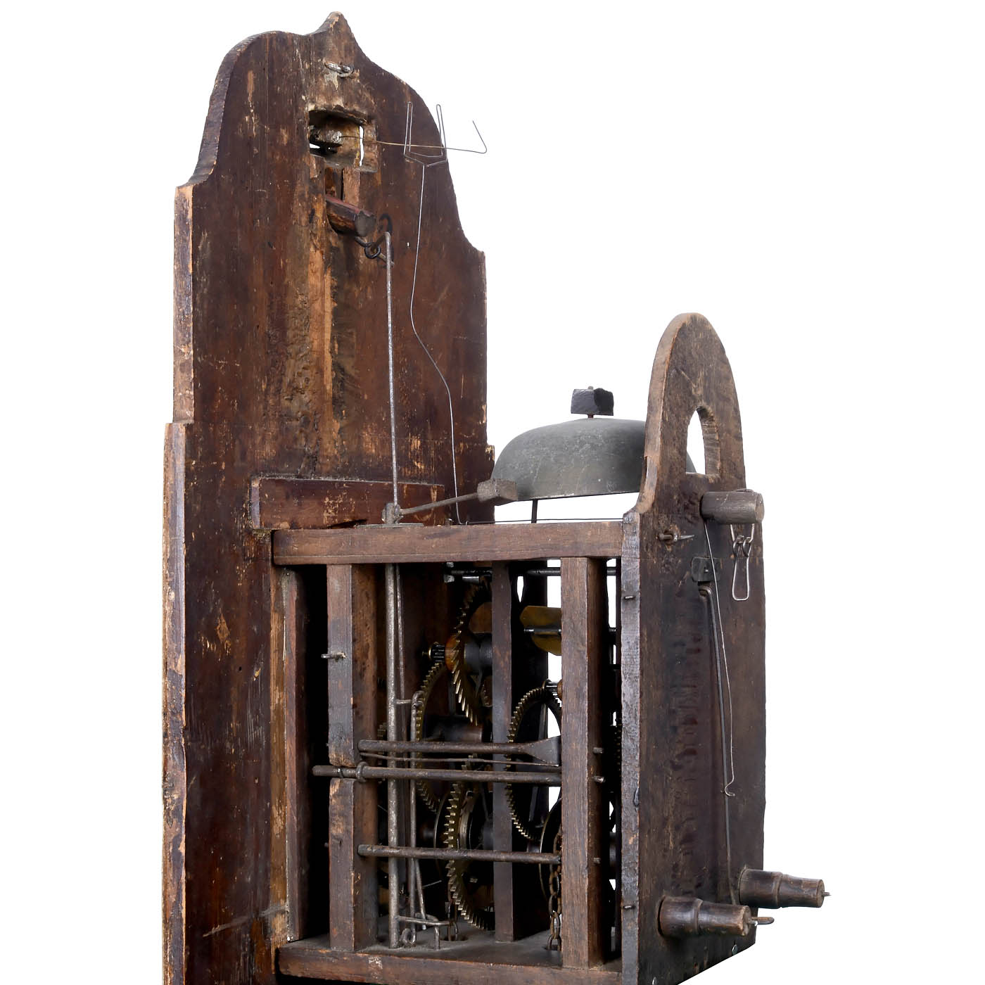 Painted wood shield with column decor, upper part with attached lion's head, wooden spindle mechanism with brass gears, striking mechanism and clockwork arranged one behind the other, hour strike on bell, rear pendulum. The eyes move synchronously with the pendulum, the mouth is coupled with the striking of the hour. With weights and pendulum, good unrestored condition.