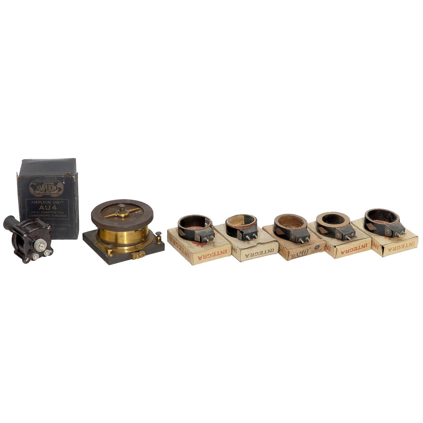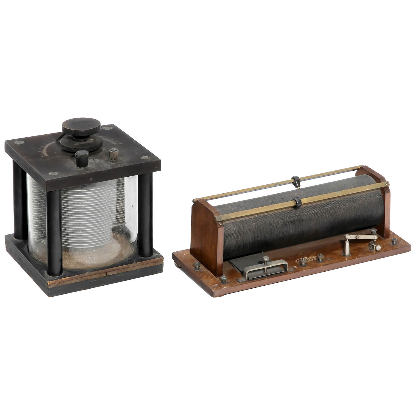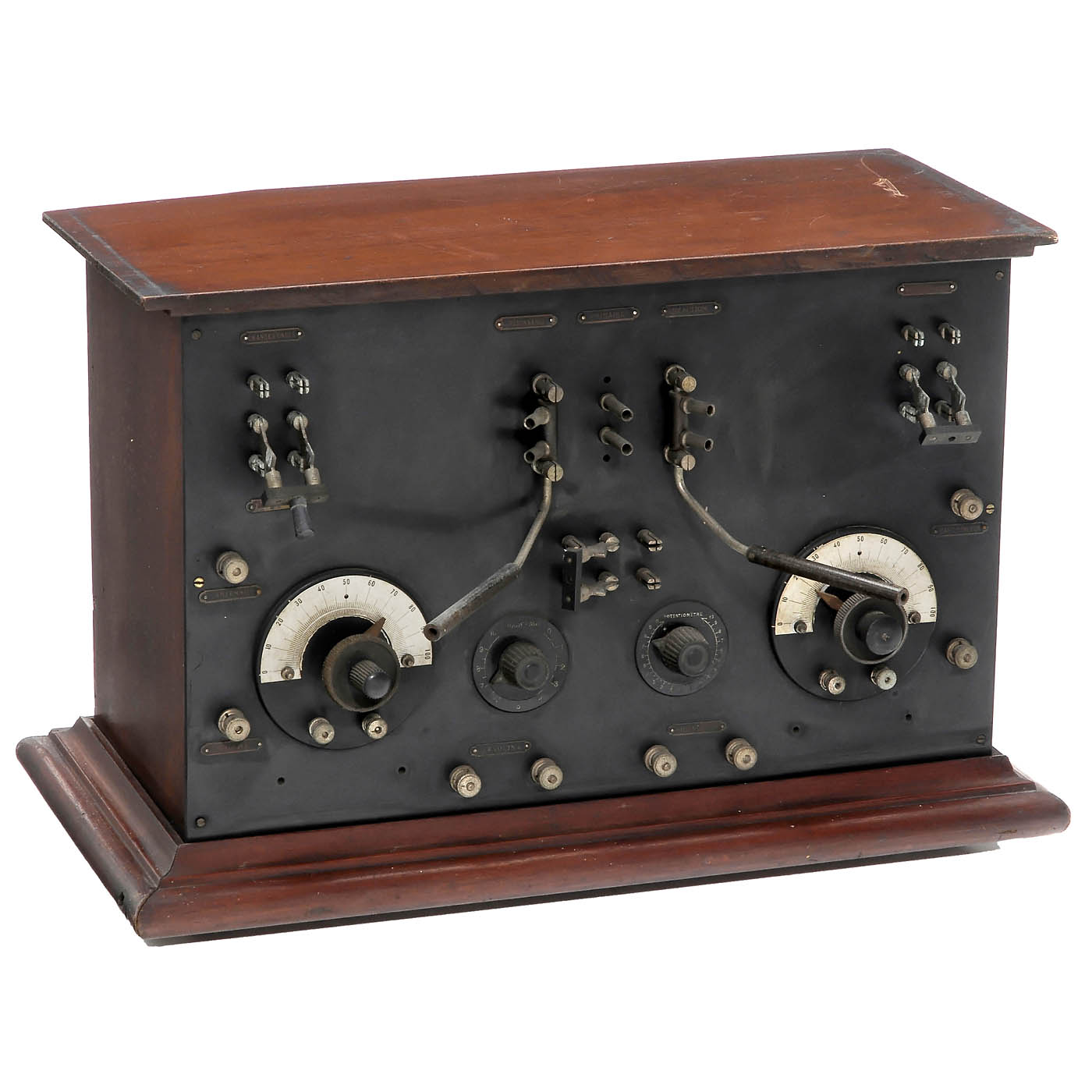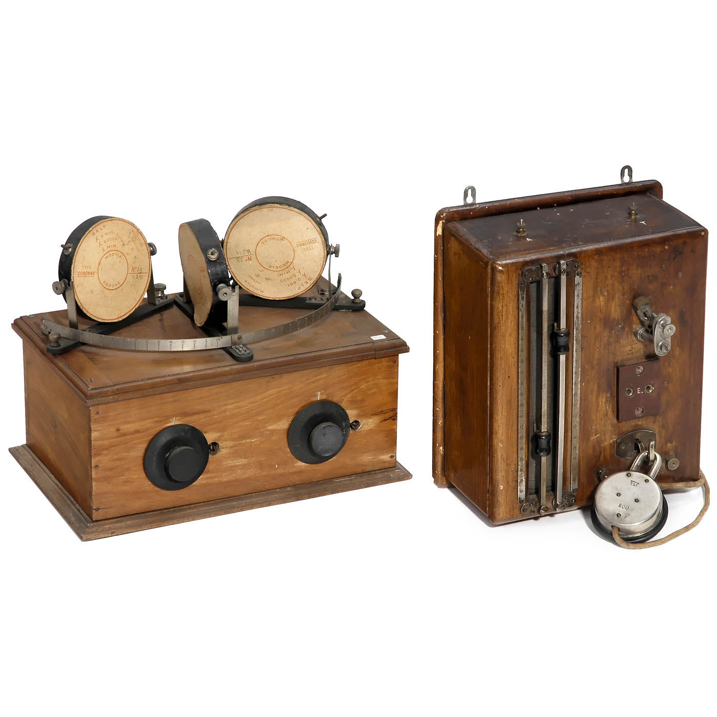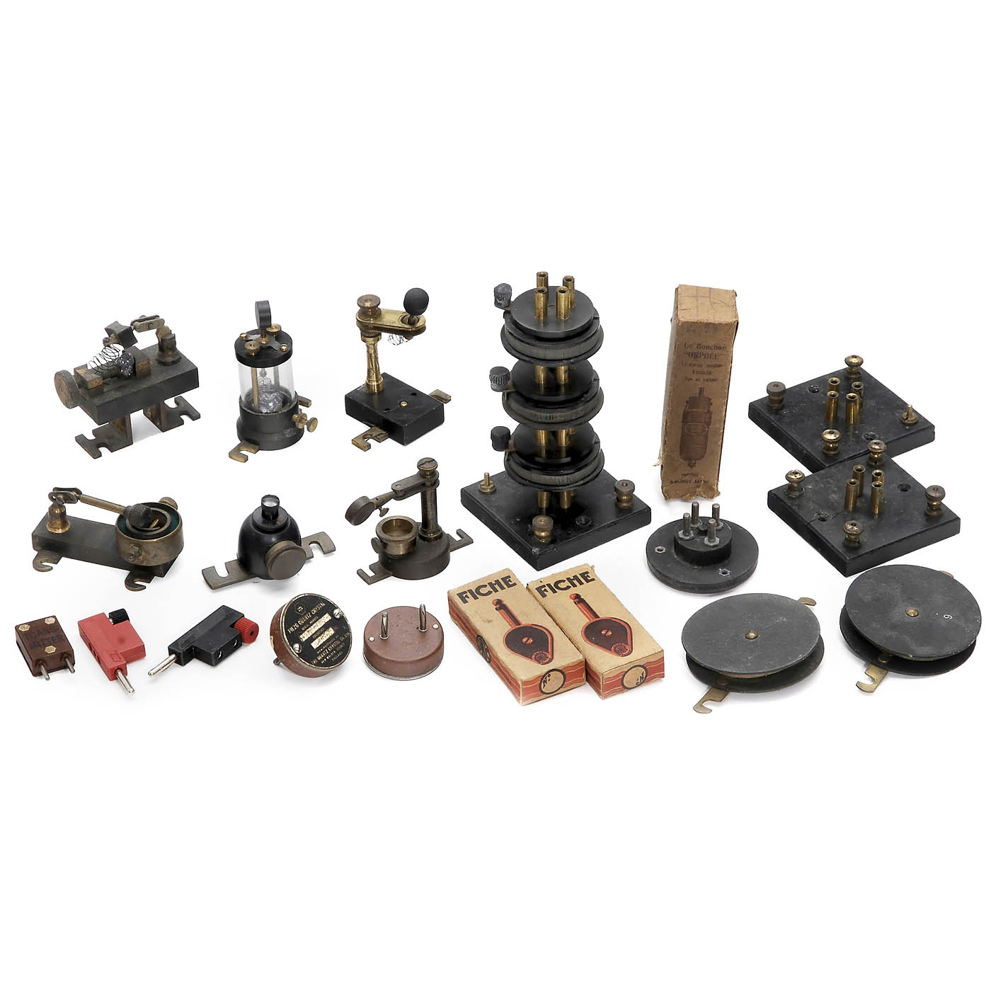 1) "Le Sans Fil", Radio Librairie Hachette, Paris. - 2) "TSF Recepteur", Picard & Frères, France. - 3) 5 detectors, 2 with crystals. - 4) 2 French radio receivers, unmarked, without tubes. - 5) Amplion Unit Type AU4, electric gramophone pick-up, complete in original box. - 6) Large rotary condenser, size 7 ¼ x 7 ¼ x 9 in. - 7) Cadre Stanislas, large rotating antenna, made by Ferry & Paul Cholin, France, Ø 18 7/8 in. - 8) Marconi's Wireless Telegraph Condenser No. 3. - 9) 28 Braun Lectron radio construction parts. - And: 10) 5 coils and further spare parts.