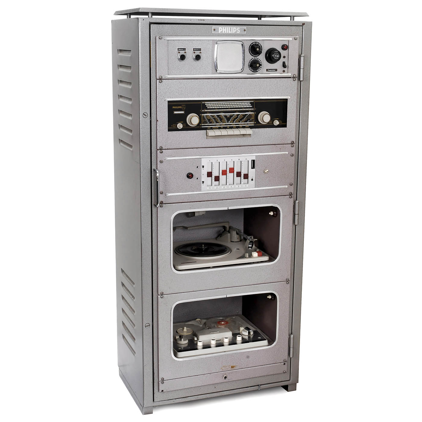Consisting of 5 components in a solid steel frame: switching unit with main switch, control speaker and 2 microphone inputs, tube radio, mixer, stereo record player AG 1025 with changer and tape recorder. Overall size 23 3/5 x 15 ¾ x 55 in.