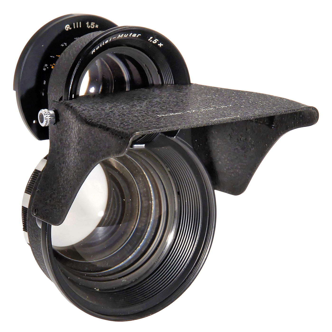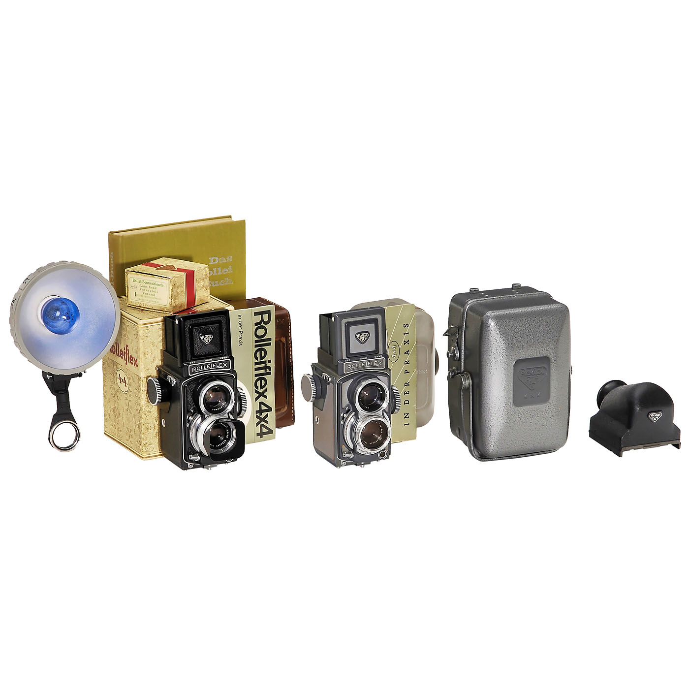 Franke & Heidecke, Braunschweig. 1) Zeiss Rollei Mutar 1,5x, no. 3570018, for bayonet III, with case. The tele-attachment in very good condition! (2/2) - 2) Rolleiflex 4x4, black, no. 2065878, c. 1963. Inoperative, with case, decorative box, instructions and sunshade in case with box. (3+/-) - 3) Rolleiflex 4x4, grey, no. 2049699, c. 1957. Shutter inoperative. With case, instructions and R1 filter. (3/-) - 4) Tropical ever ready case "Tropen-Box" for Rolleiflex 4x4. Rare! (3+/-) - 5) Rolleiflash with holder bay. I. (3+/-) - 6) For Rolleiflex/Rolleicord: Penta-Prisma with case. (3/3) - And: 7) Heering, "Das Rollei-Buch", 1964.