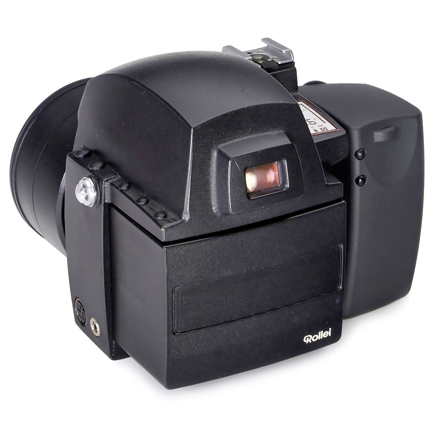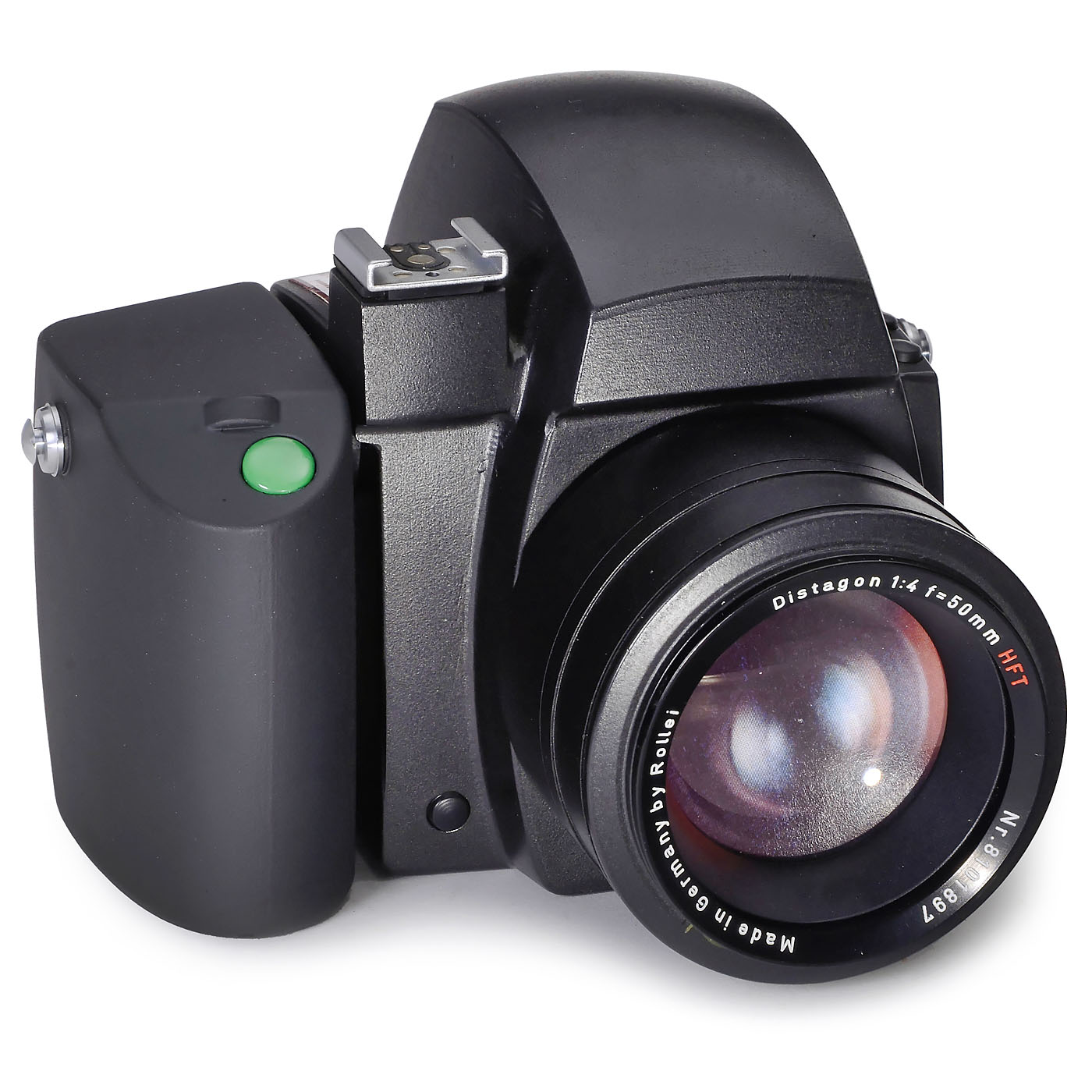 Dummy or pre-production 1:1 scale model of a 4,5 x 6 cm SLR, with interchangeable magazine and rotation grip. An ingenious and handsome piece.