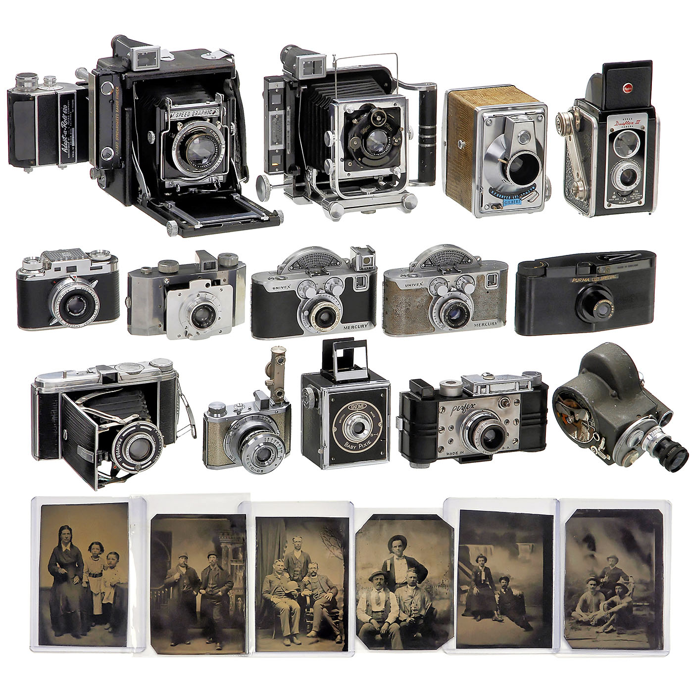 1) Graflex. Miniature Speed Graphic, for 2 ¼ x 3 ¼ in., with Tessar 3,5/10,5 cm, with focusing screen back and 620 roll film cassette. (3+/3) - 2) Riley. Rilex, for 48 x 76 mm, with Zeiss Tessar 4,5/10,5 cm, 2 screws missing from front plate. (3/3) - 3) Sekonic Studio Exposure Meter, works. (3/3) - 4) Kodak Duaflex III. - 5) Pontiac, Paris. Bloc Metal 45, 6 x 9 cm, Tylor 4,5/105 mm in Prontor II. (3/3) - 6) Mercury Univex CC, on front without leather, but apparently original. (4/3) - 7) Mercury Univex CC, with removable Univex viewfinder. (2-/3) - 8) Gelto-D III, chrome, "made in occupied Japan", with removable nickel-plated Gelto distance-meter. (2-/3) - 9) Hunter. Gilbert, 6 x 9 cm box, exotic brown leather. (3/-) - 10) Gnome. Baby Pixie. (2-/3) - 11) Bolsey. Jubilee, 24 x 36 mm. (3/3) - 12) Perfex Speed Candid 1938, with typographic engraving of the owner from 1939. (3-/3) - 13) Purma Special. (3/3) - 14) Gallus. Derlux. (3/-) - 15) Emel C 93. Double-8 film camera, spring-drive works. With Cinor 1,9/12,5 mm and wide-angle attachment. (3/3) - And: 16) Approx. 30 good ferrotypes of the inhabitants from 1890-1920.