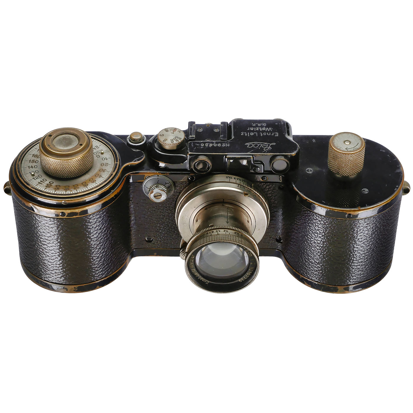 Leitz, Wetzlar. Synchronised beside viewfinder, with Leica II top plate no. 98886, baseplate with heavy signs of use, Summar 2/5 cm, lens no. 167739, KOOBF cassette and very worn ESFOO case. Camera with attractive used patina.