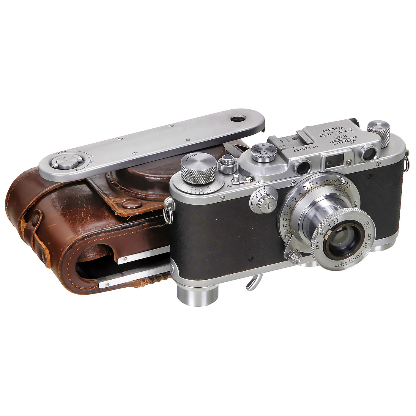 Leitz, Wetzlar. 1) Leica IIIa, no. 338197 with Elmar 3,5/5 cm without number. Long times stick. (3/3-) - 2) SCNOO rapid winder. (3+/3) - And: 3) Rare ever ready case EPZOO for Leica with rapid winder. (3/-) - Literature: Lager, vol. III, p. 344.
