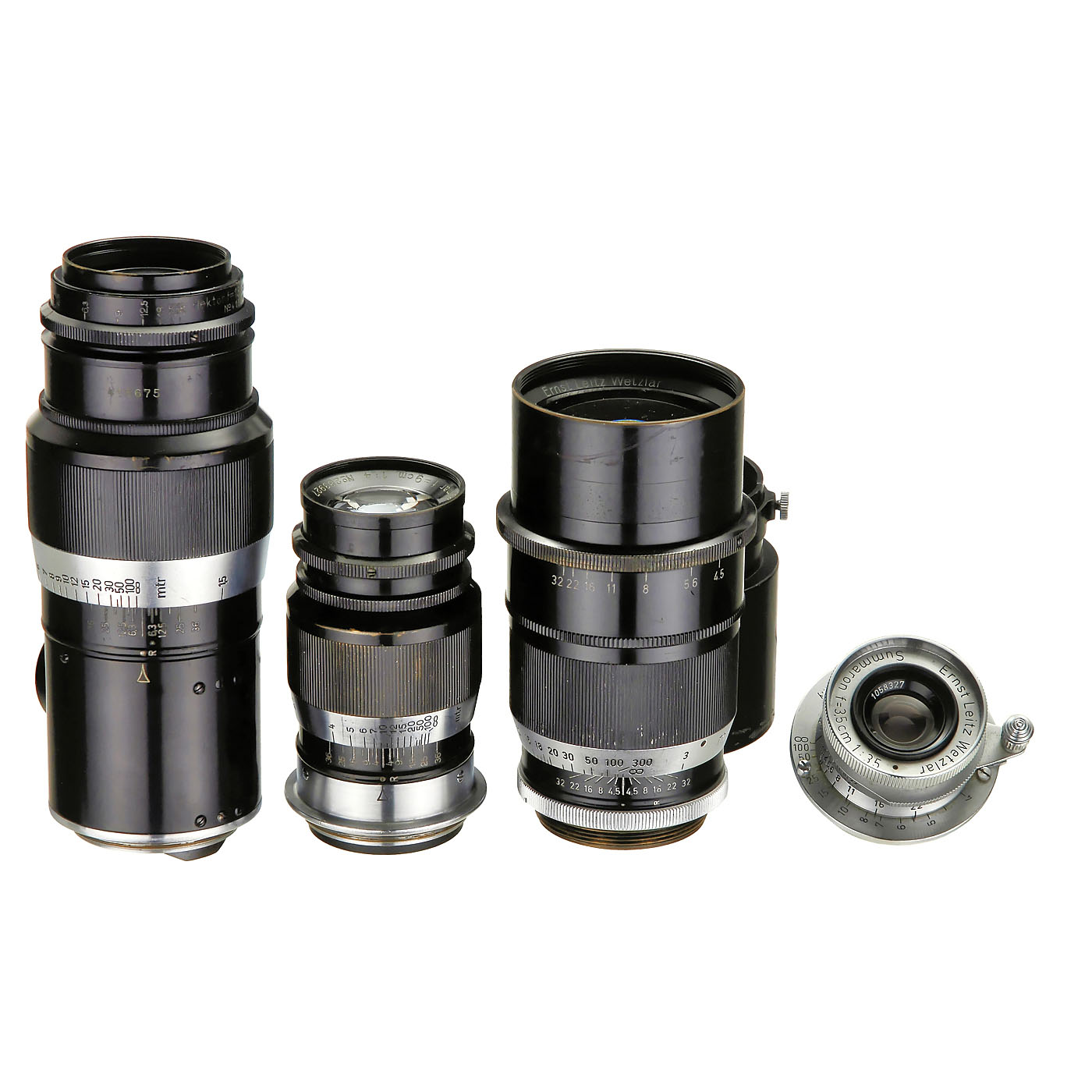 Leitz, Wetzlar. 1) Summaron 3,5/3,5 cm no. 1058327, feet scale, c. 1953, light dust inside, with caps. (2-/3) - 2) Elmar 4/9 cm no. 283927, c. 1935. Aperture scale up to 36, glass clean, with bakelite front cap. (3/3) - 3) Hektor 4,5/13,5 cm, no. 415675, front lens scratched, inside minor lens separation, with red tube, base glued. (3/4) - And: 4) Telyt 4,5/20 cm, no. 768463, c. 1950, glass and coating very clean, for Visoflex. With sunshade and back cap. (3/3)