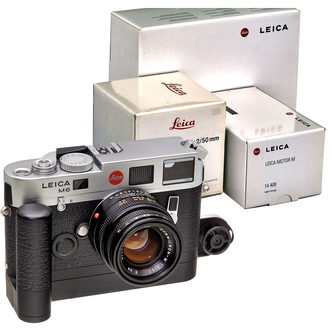 Leica AG, Solms. 1) Leica M6 TTL (0.85), no. 2593224. With box, camera box, instructions, papers and strap. Top-end camera in top condition! TTL flash function not tested. (1-/2) - 2) Summicron-M 2/50 mm no. 3747332, c. 1996, final version with collapsible sunshade. Nearly-mint condition! With caps. (1-/2) - And: 3) Leica Motor M type 14408 no. 05780. With box, instructions and papers. As above, in super condition! (2-/2)