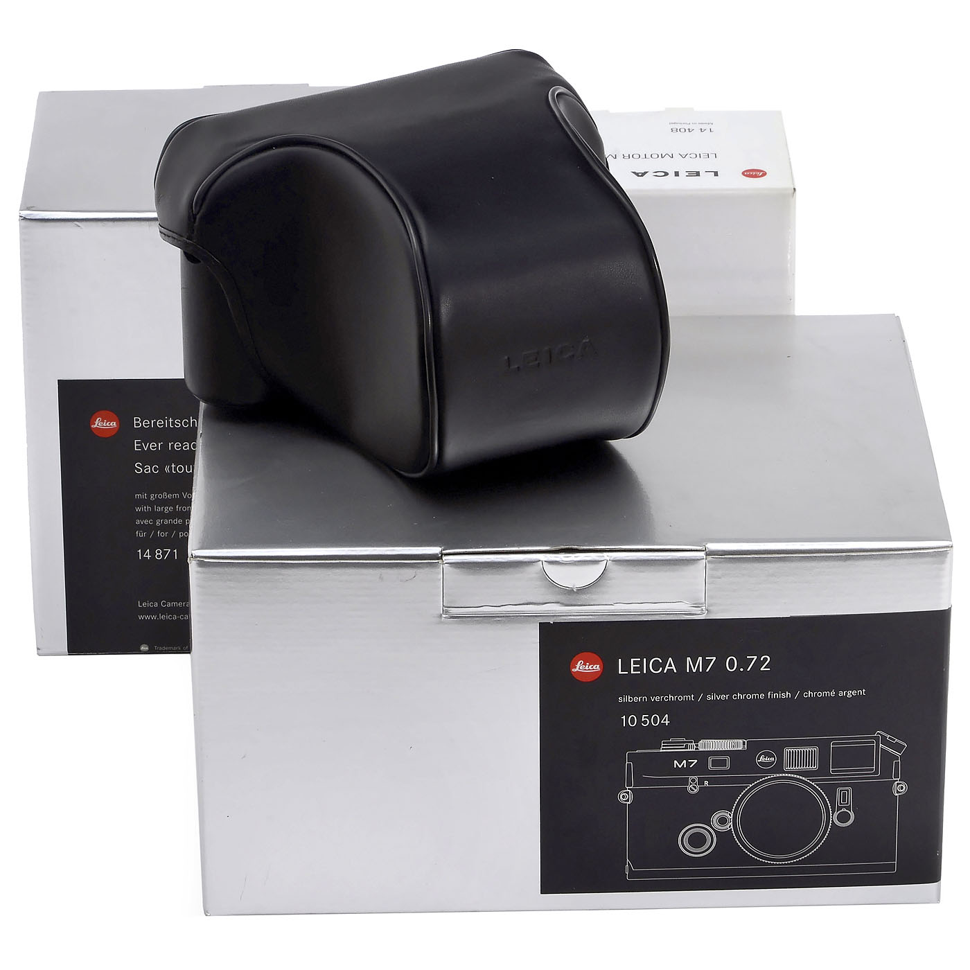 Leica Camera AG, Solms. Leica M7 (0.72) no. 2780119 with motor M no. 01837. All in near-mint condition! With presentation box for M7, card box, guarantee card, certificate and strap. Together with an extra large Leica "soft release". Motor with box, guarantee card and certificate. With a new compartment case 14871. - Perfect camera! Perfect condition!