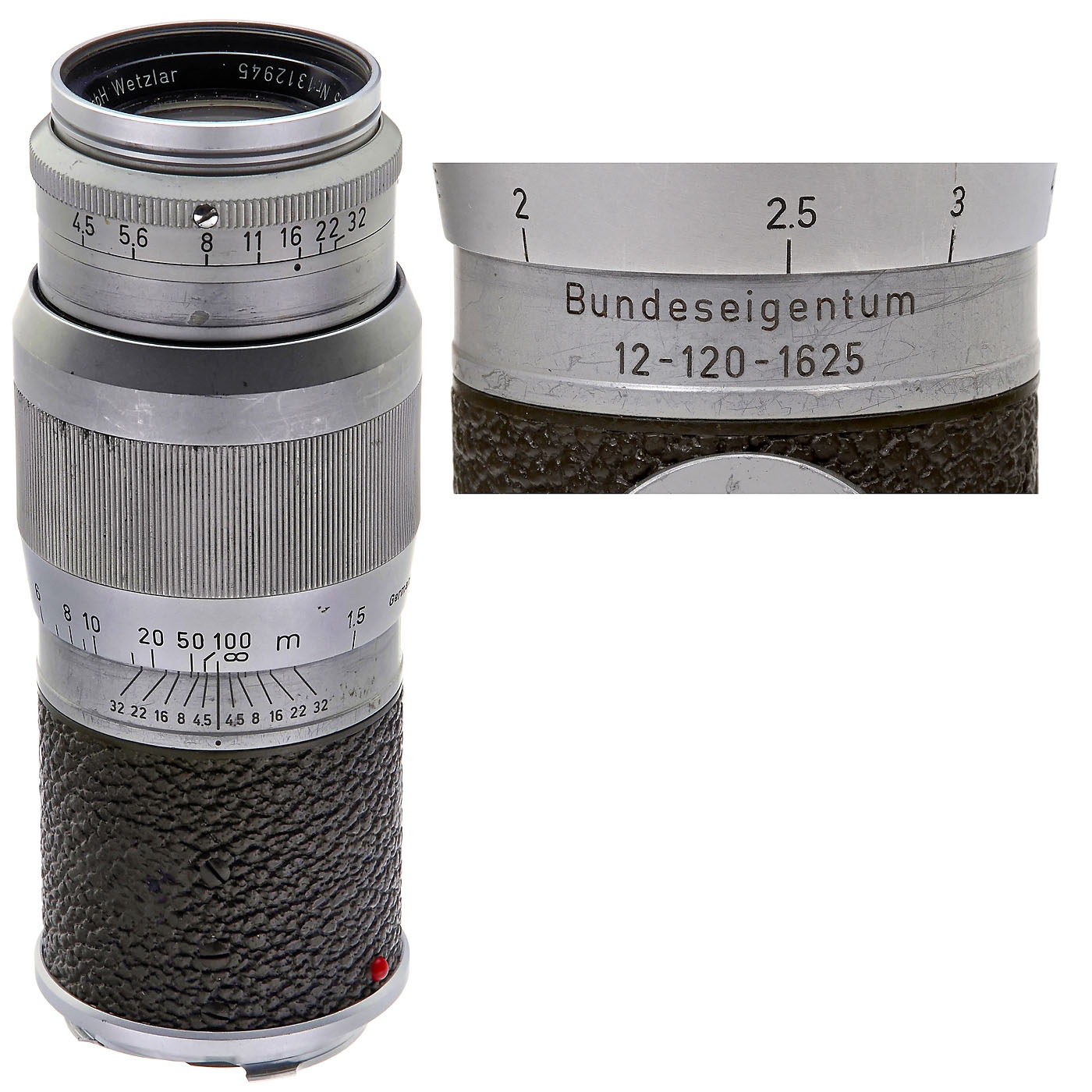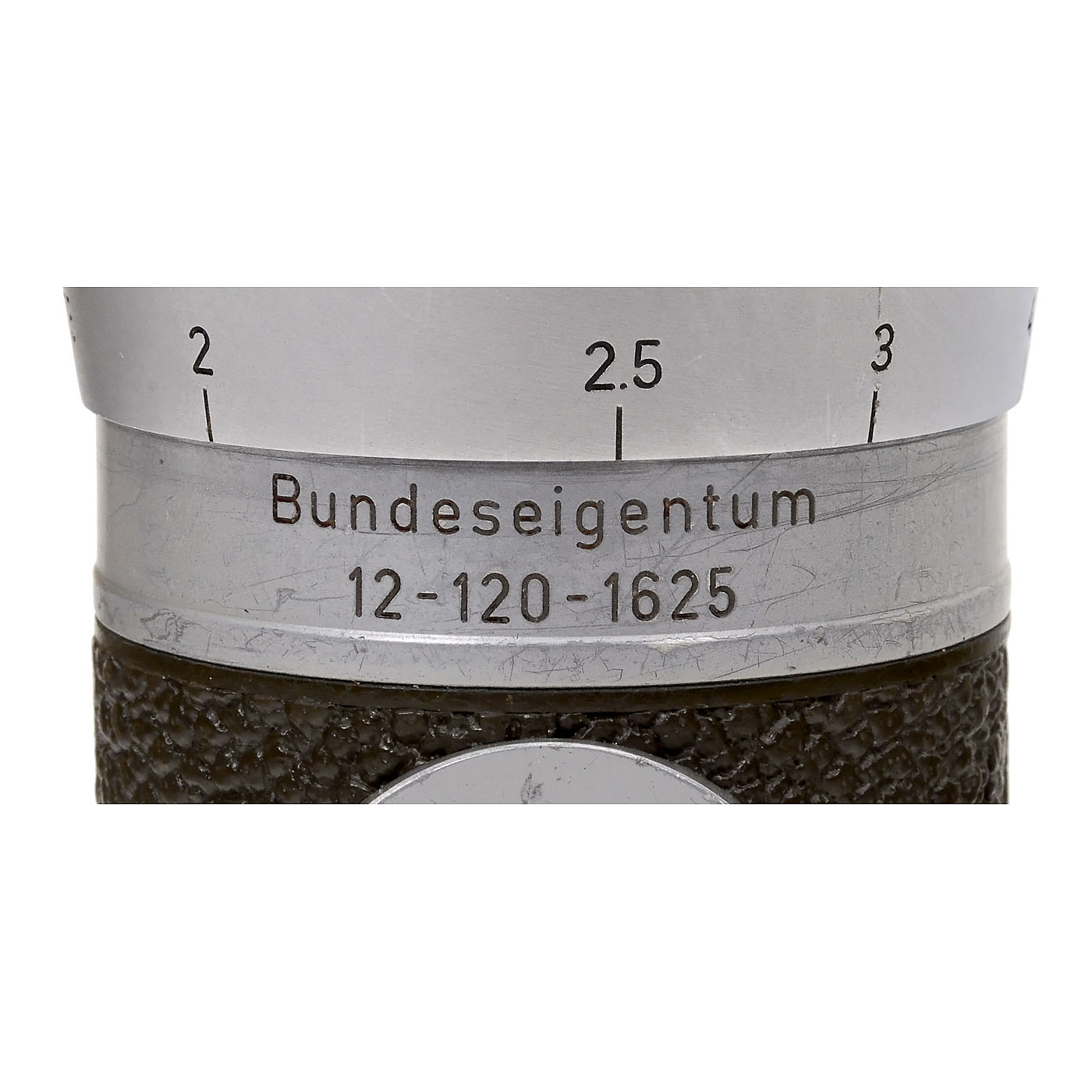 Leitz, Wetzlar. No. 1312945, for M, engraving "Bundeseigentum 12-120-1625", with olive-colored covering, front and back cap, cleaning marks on front element, interior element with fog at edges, focusing sticks under 8 meter.