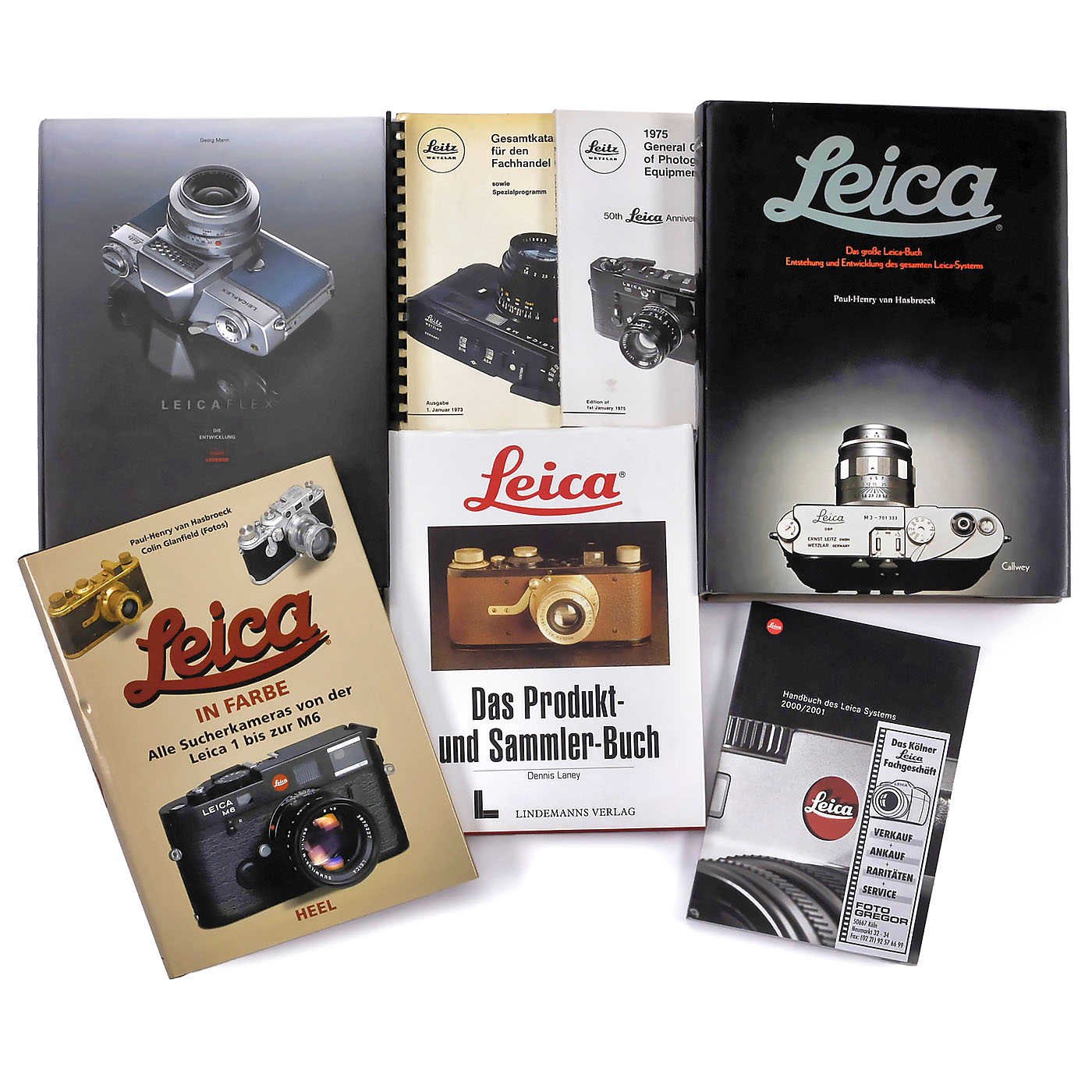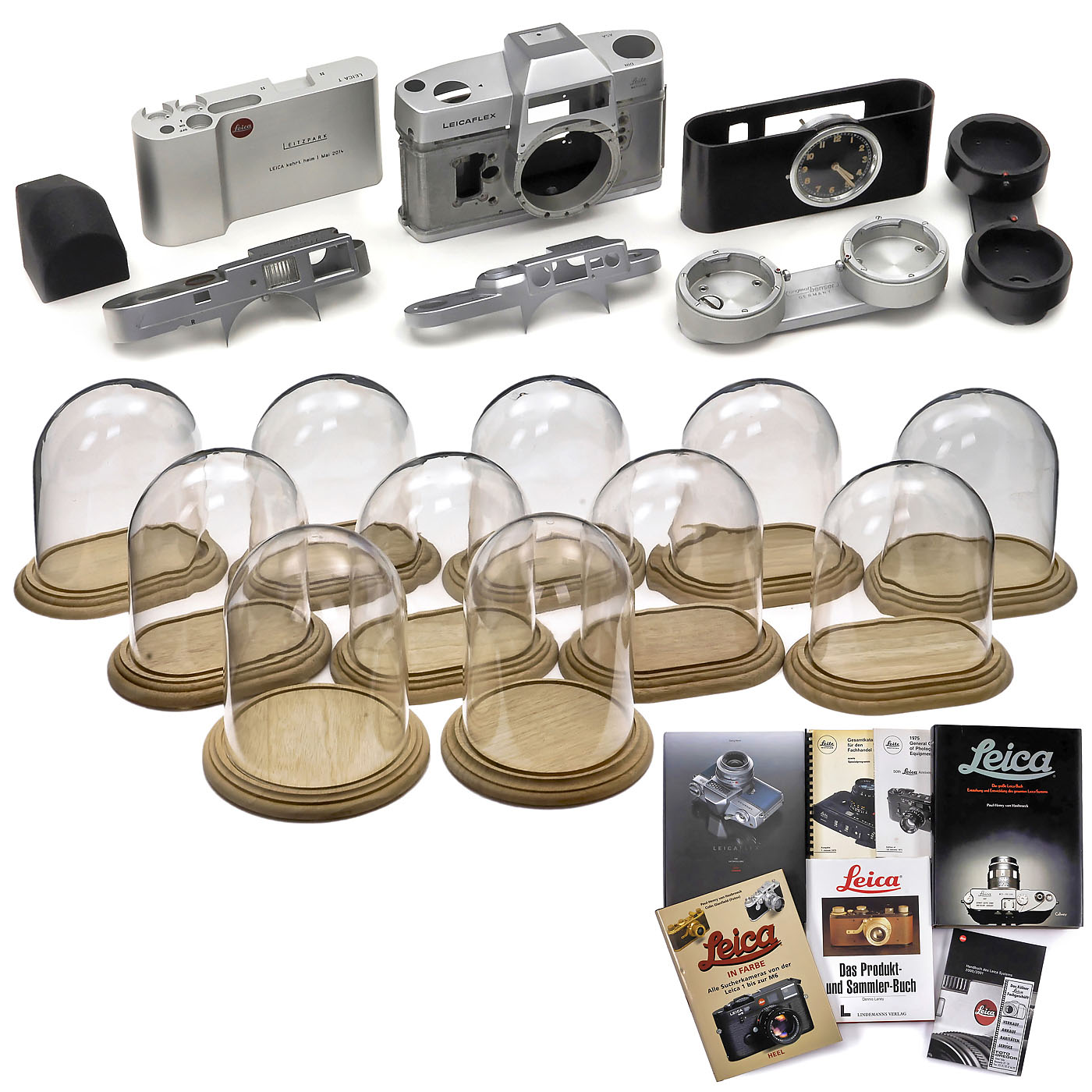 1) Leicaflex partially mounted casting, with ground plate and body cap. Very good exhibition piece to demonstrate the process of manufacture. - 2) Casting of a Leica T. Was offered in limited quantity because change of residence from Solms to Wetzlar "Leica kehrt heim 2014". (2/-) - 3) Body cap of the Leica IIIg, unnumbered. (2-/-) - 4) Body cap of a Leica M2, invalid number. (3/-) - 5) Benser lens holder for Leica M in chrome. (3-/-) - 6) Benser lens holder for Leica M in black, with box. (3/-) - 7) Cap of prism for Visoflex III. - 8) Casting of a Leica M with incorporated clock, works, black painted, selfmade construction! (3/-) - 9) 4 Leica books in German: Georg Mann, Leicaflex (2015); Hasbroeck, Leica, das große Leica-Buch (1988); Laney, Leica, das Produkt- und Sammler-Buch (1995); Hasbroeck und Glanfield, Leica in Farbe (2001); 2 Leitz catalogs 1973 and 1975 and "Handbuch des Leica Systems 2000/2001". - And: 10) 2 round plexi-domes, height 20 cm, with wood base, and 9 square-rounded plexidomes with heigth of 19 cm, with wood base, all near-mint. Ideal, to present dust-safe all exquisite cameras and lenses.