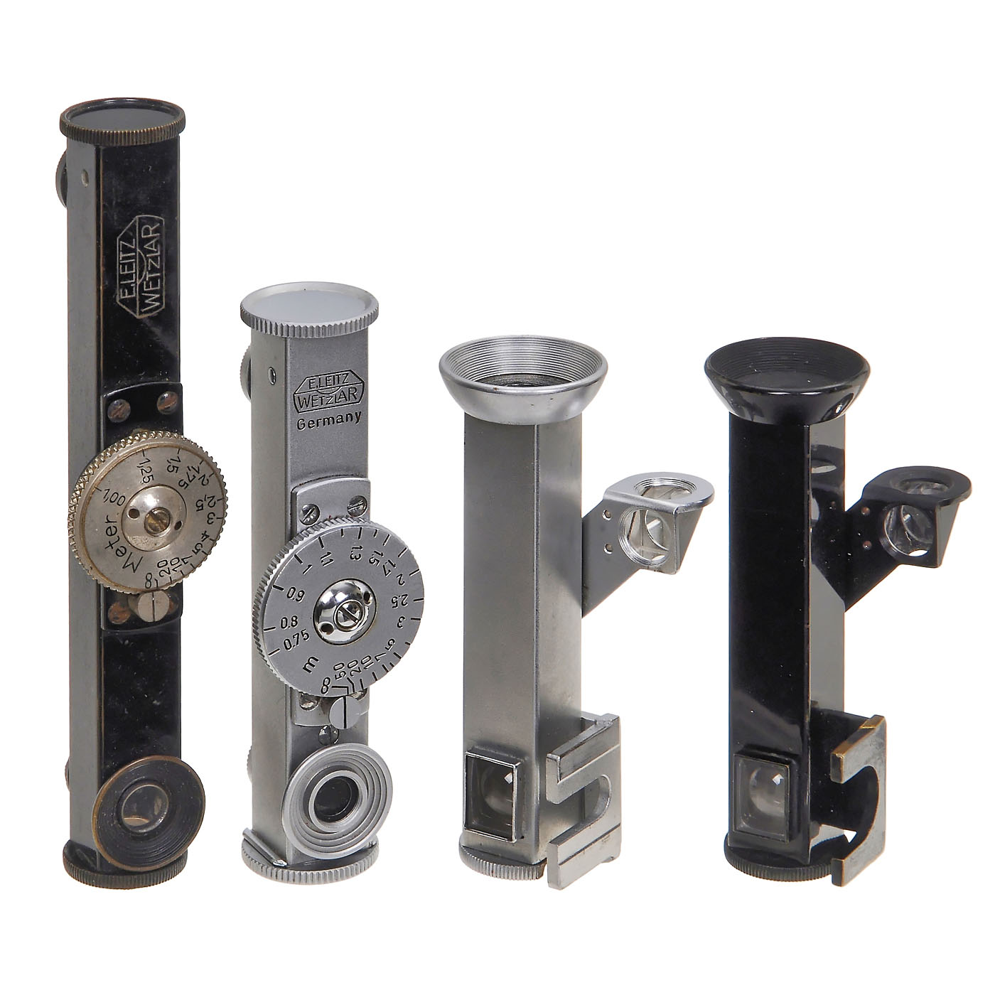 Leitz, Wetzlar. 1) Viewfinder SBOOI 5 cm. Very clean view. (3/2) - 2) Spectacle viewfinder SDPOO for the close-up Summicron 50 mm. (3-/3) - 3) Universal viewfinder VIOOH/1200 no. 90643, with case. (3/3) - 4) VIOOH/1200 no. 71226, with case. (3-/4) - 5) Right-angle viewfinder WINTU, chrome. (3+/3+) - 6) WINTU black, older model. (3/3) - 7) Universal frame finder RASUK, feet scale. (3/-) - 8) Viewfinder SQTOO for Telyt 40 cm, back part missing, with box. (2/-) - 9) Focusing meter FOKOS-CHROM. (2-/3) - And: 10) Focusing meter FODIS, no. 24817. (3/3)