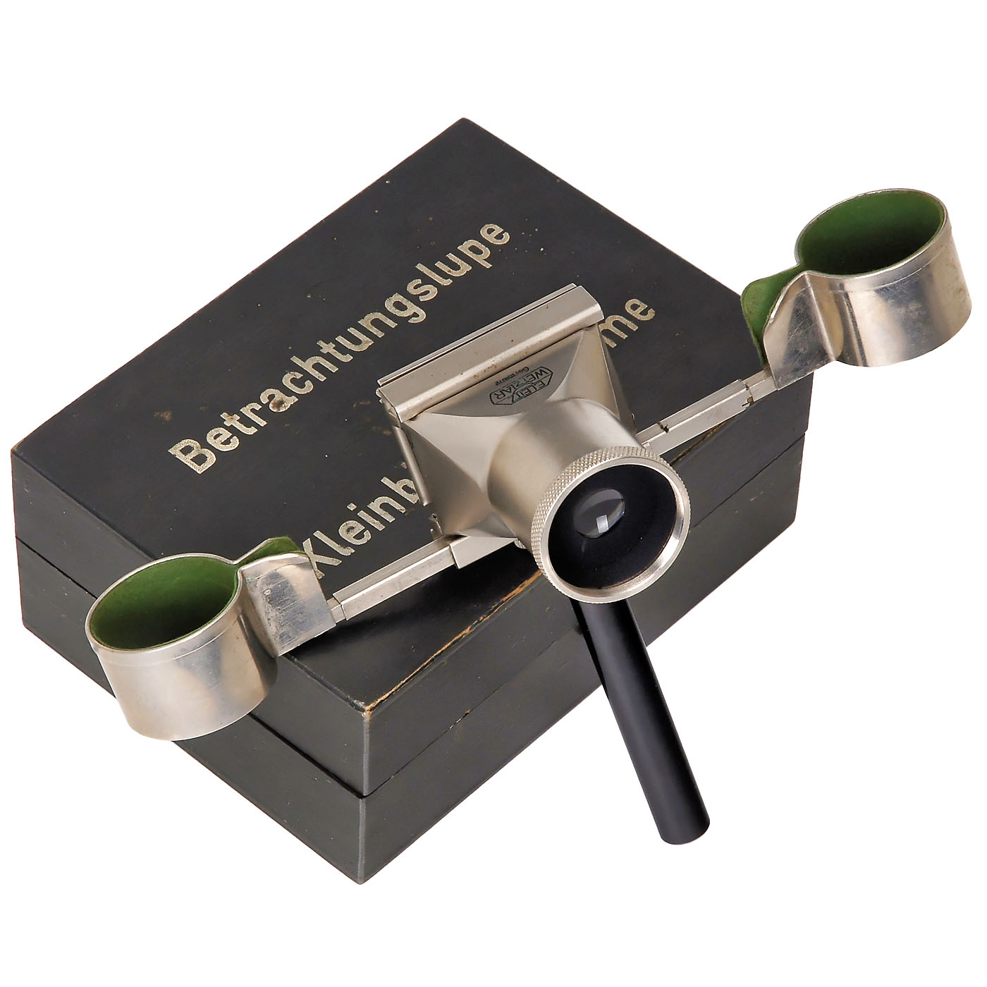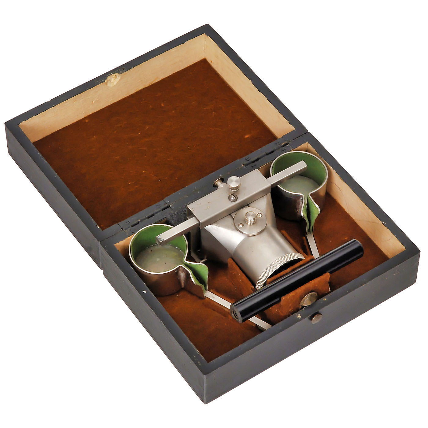 Leitz, Wetzlar. Film negative viewer NAKUL possibly for inspecting film shot in the 250-exposure Leica Reporter, with marking device, with grey wood box with white lettering and light-brown felt lining. This viewer, equipped with special cups to hold long lengths of film, is extremely rare. - Literature: Lager, vol. III, p. 234.