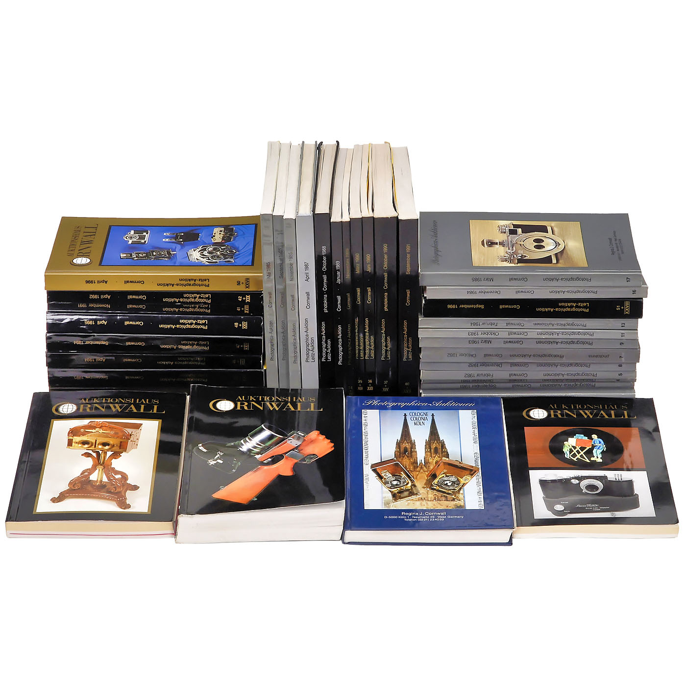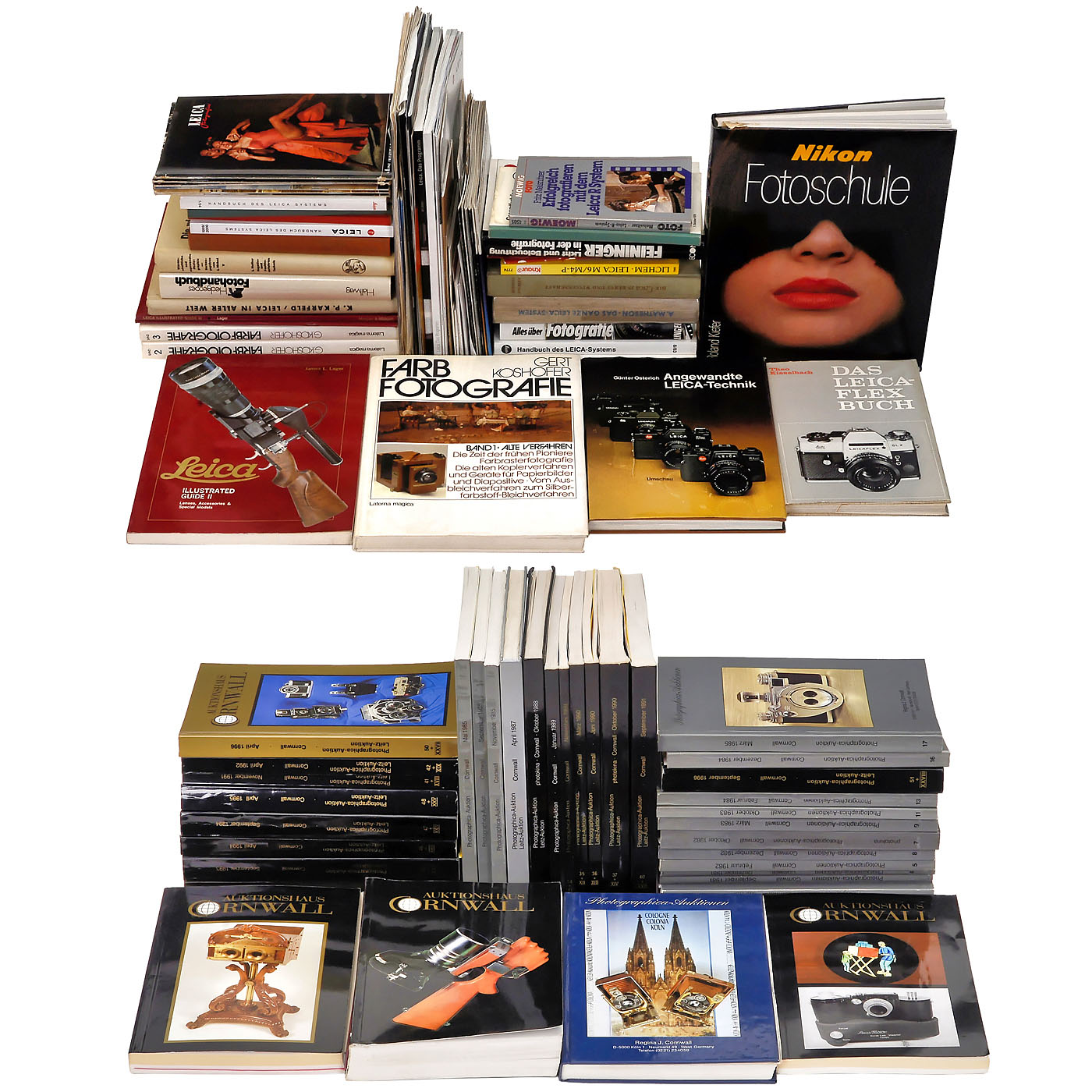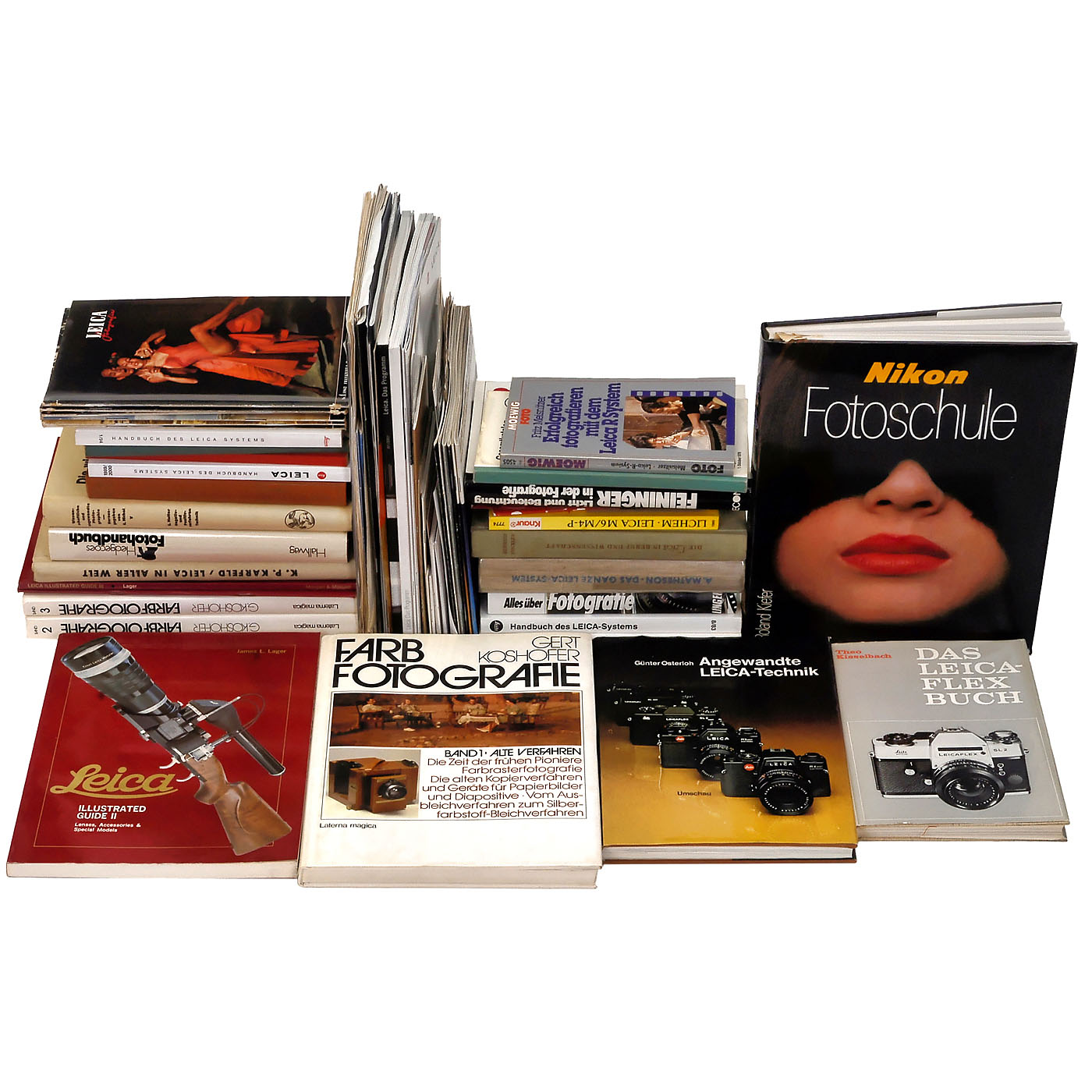 1) Leica literature: Lager - Leica Illustrated Guide 1925-1975, 1976; Lager - Illustrated Guide II, 1978; Lager - Illustrated Guide III, 1979; Karfeld - Leica in aller Welt, 1938; Matheson - Das ganze Leica System; Stöckler - Die Leica in Beruf und Wissenschaft, 1954; four additional volumes. - 2) Group of Leica/Leitz catalogs, brochures, manuals, press releases with b/w photos, Leica-Fotografie 1962 complete, not all photographed. - 3) Scientific literature: Mutter - Die Technik der Negativ- und Positivverfahren, Springer 1955; Koshofer - Farbfotografie, volumes I, II and III, 1981; Gernsheim - Die Fotografie, 1971. - 4) 36 Cornwall catalogs, from no. 1 (3/1981) to no. 57 (9/1999). - And: 5) Four more practical books.