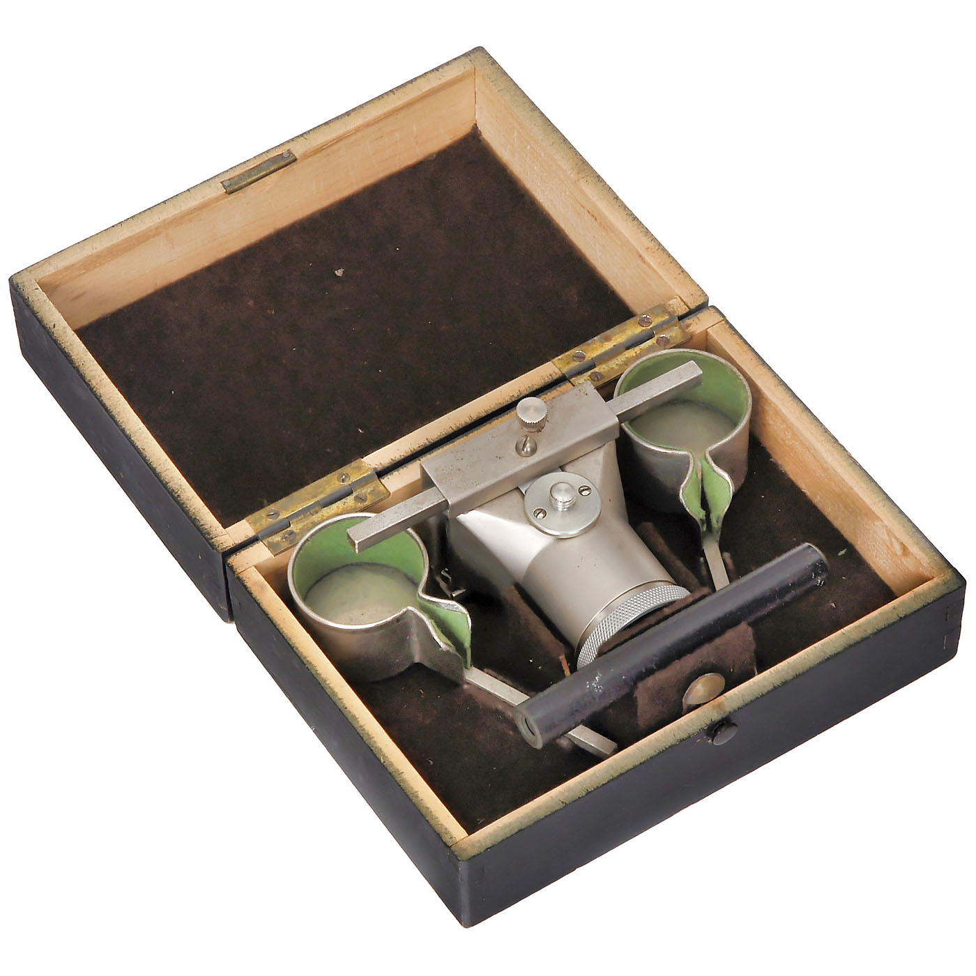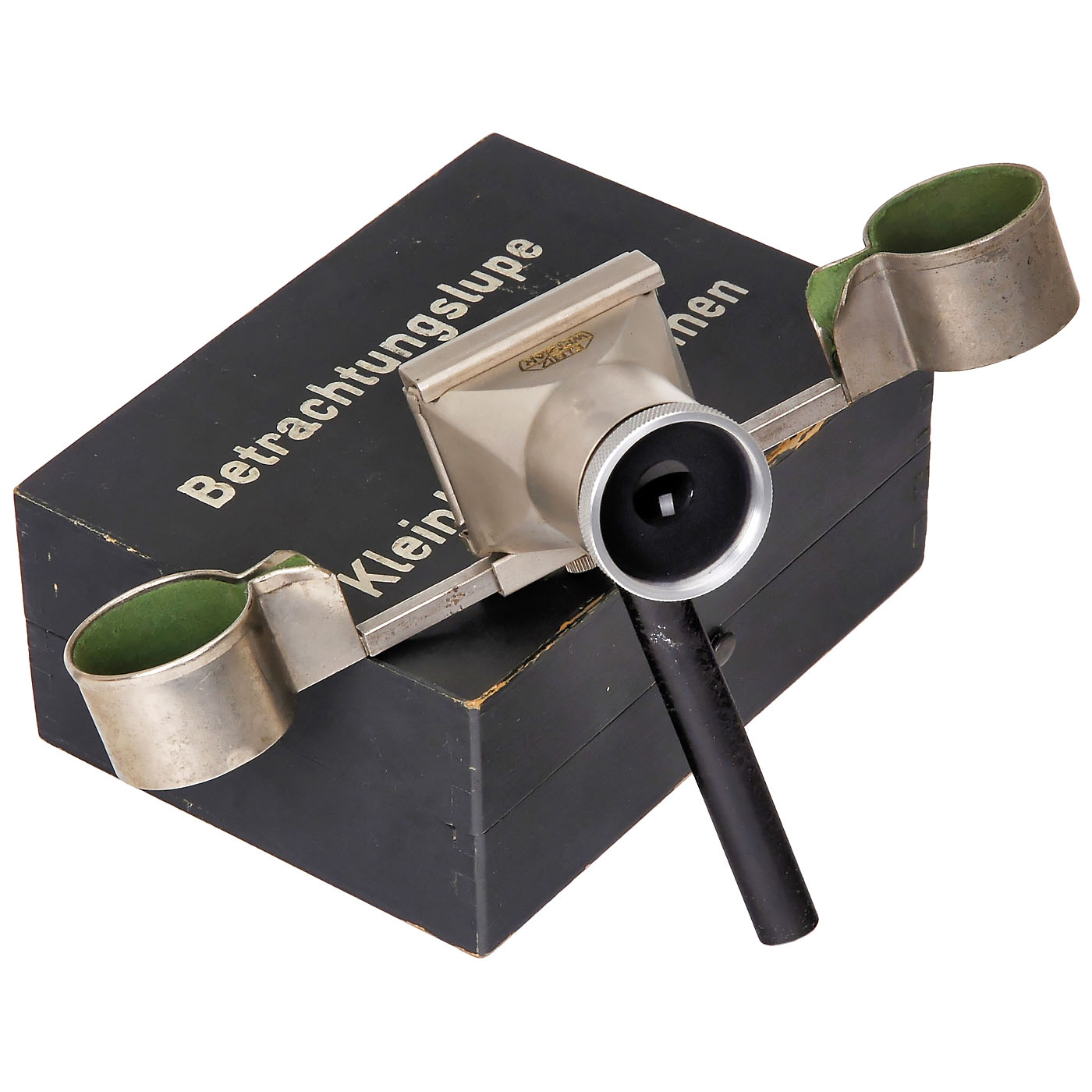 Leitz, Wetzlar. Film negative viewer NAKUL, possibly for inspecting film shot in the 250-exposure Leica Reporter, without marking device, equipped with rare special cups for holding long lengths of film, in grey wood case with white lettering. - Literature: Lager, vol. III, p. 234.