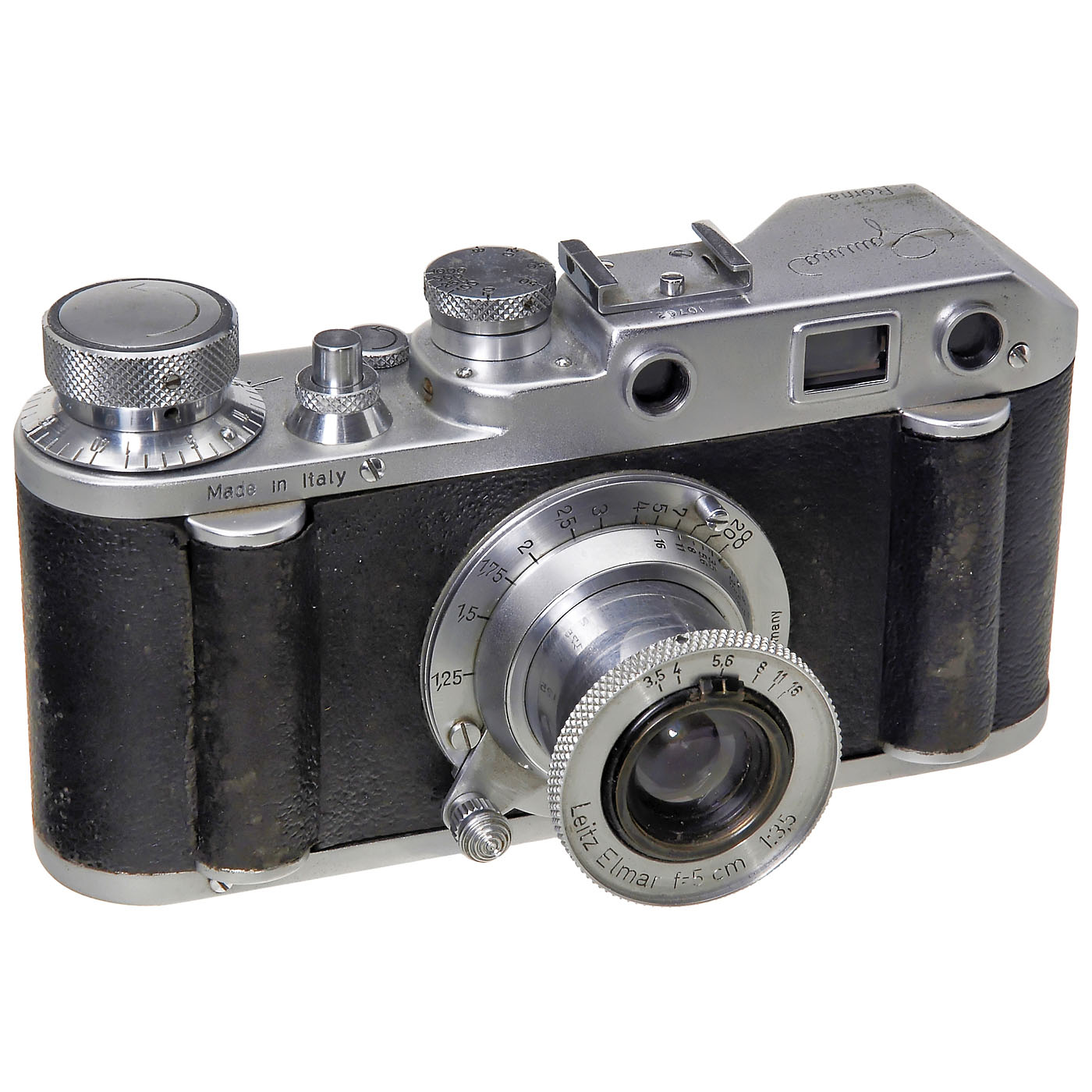 Gamma, Italy. No. 10763 inside and outside. Rare Leica copy with screw-mount M39, coupled rangefinder, curved metal focal plane shutter B, 1/20-1/1000, Elmar 3,5/5 cm no. 598398 (c. 1945) and cap, good working condition, hinged pressure plate missing, a different construction than the earlier Gamma III.