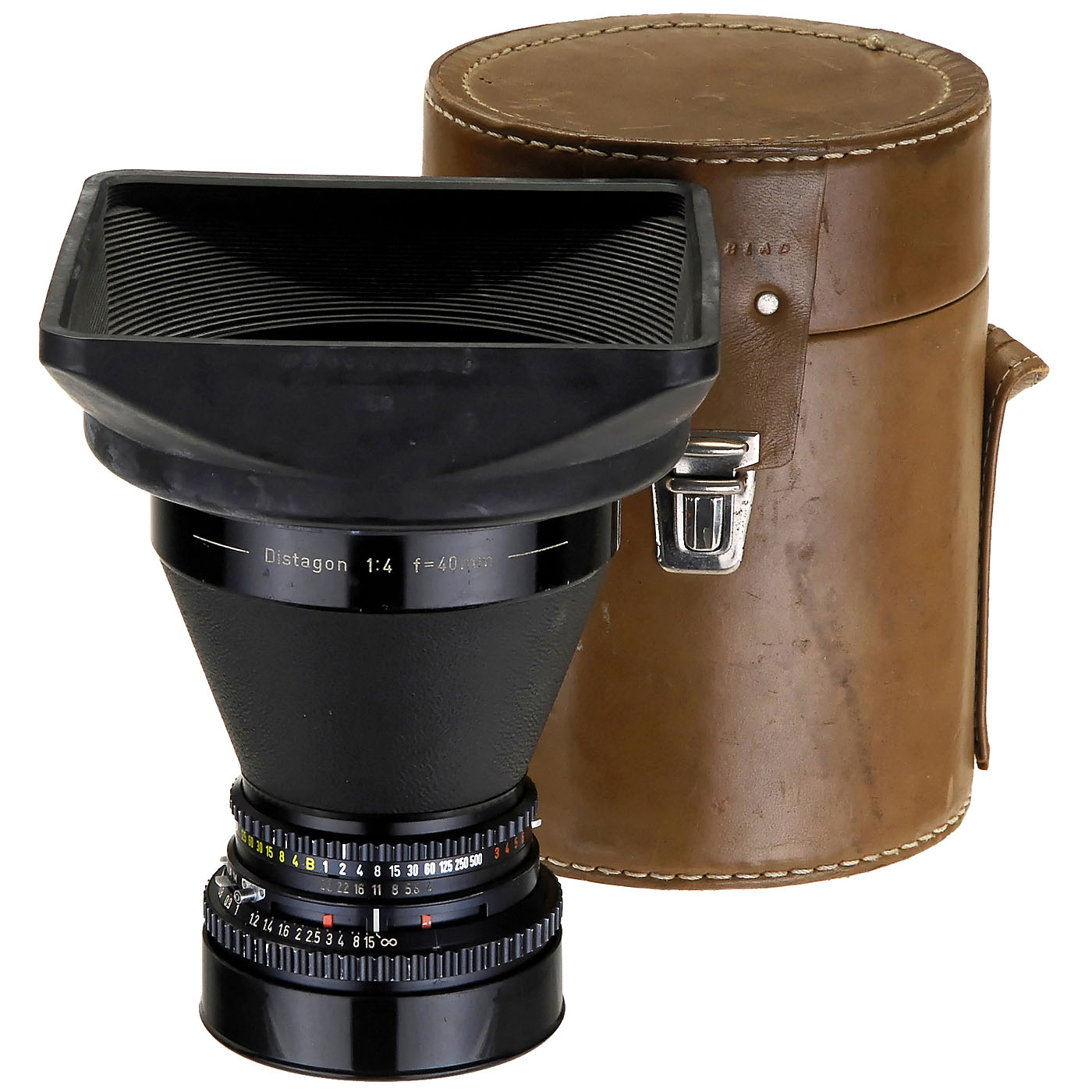 Hasselblad, Sweden. Carl Zeiss Distagon T 4/40 mm, no. 5455369. With sunshade, both caps and leather case.