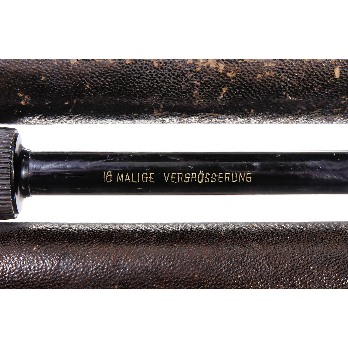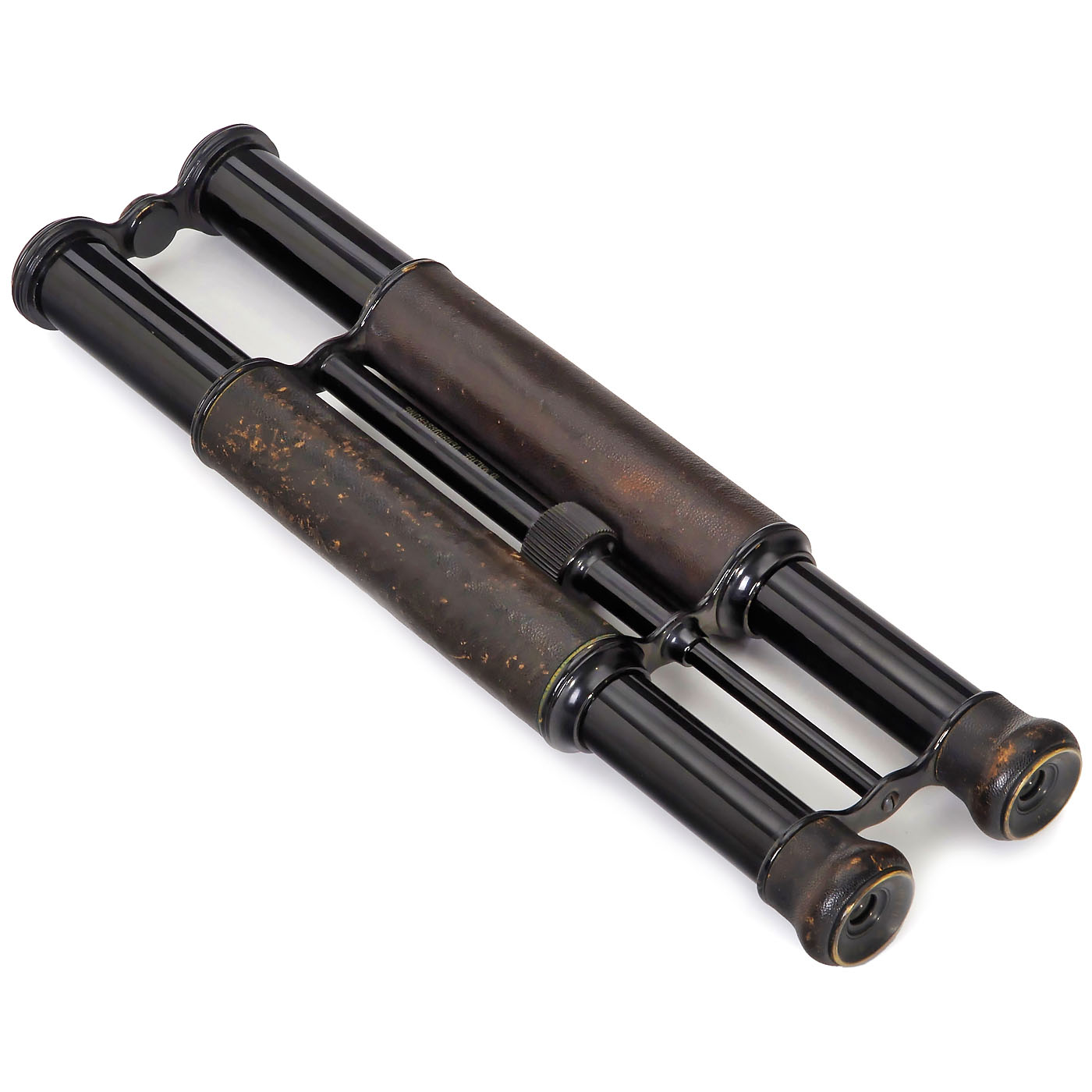 Inscribed on the eyepieces "Haase & Wilhelm, Prag", sixteenfold magnification (engraved on central driveshaft), black-lacquered brass, leather-covered tubes and eyepiece-mounts, bridge between the objectives with inset compass, length extended 14 in., very clear image. A rare design, in very good original condition.