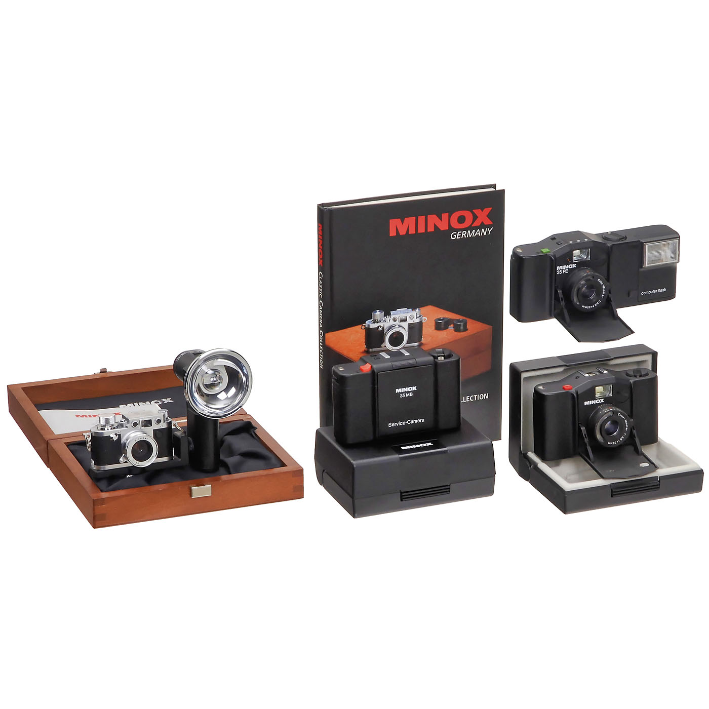 Minox, Gießen. 1) Minox 8 x 11 mm in Leica IIIf no. 525001, with wood case, box, instructions and Classic flash, with box. (2/2) - 2) Minox 35 MB Service-Camera, no. 4415424. These cameras were given to the client, when his camera was in service. Rare to find! With number-identic carton, case and instructions. (2/2) - And: 3-4) Minox 35 EL and 35 PE, not tested. With Minox book by Hillebrand.
