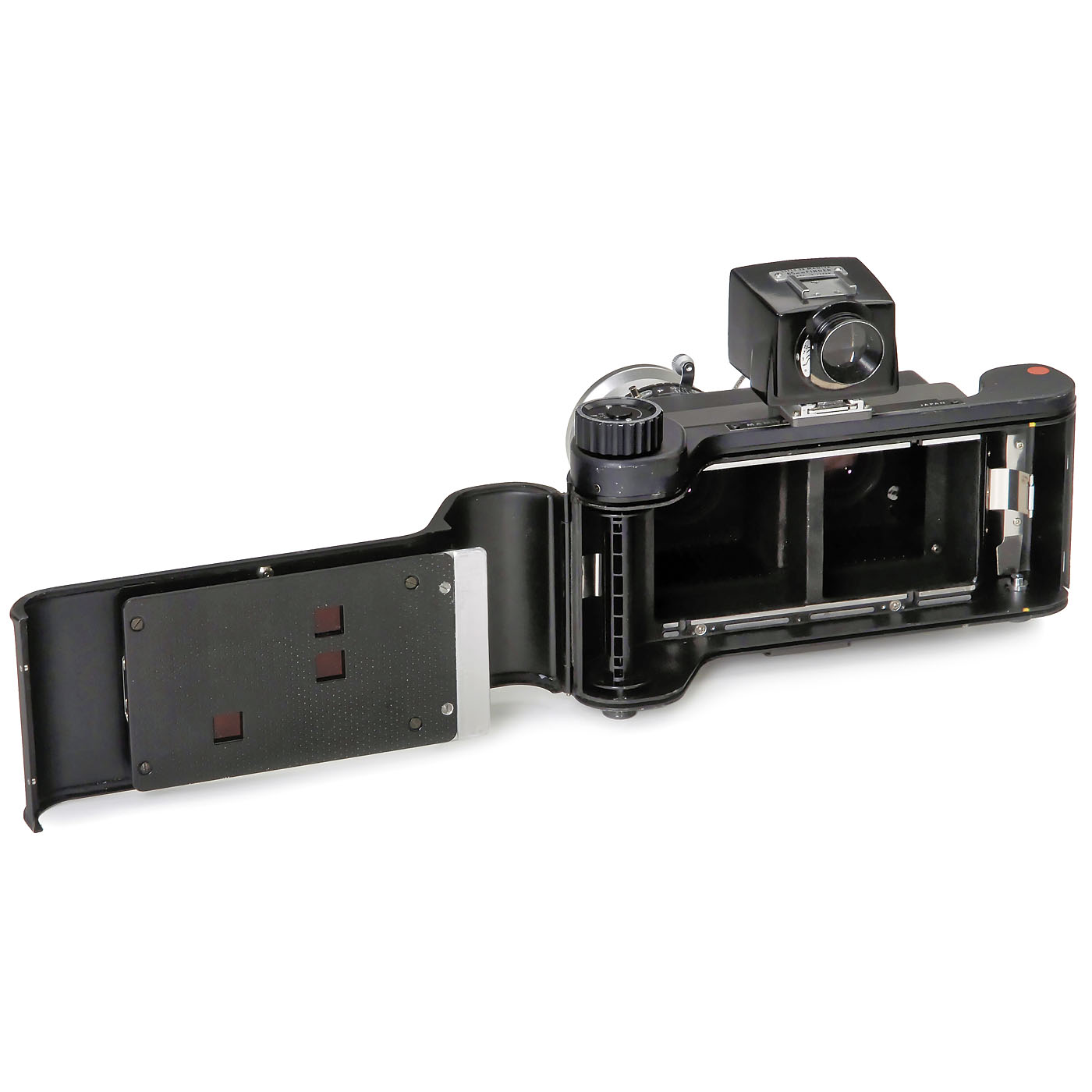 Graumann, Germany. Stereo camera for two 6 x 6 cm pictures, based on a pair of original wide-angle lenses from the final wide-angle TLR Rolleiflex model with Schneider Super Angulon 4/50 mm, fixed-focus distance setting to infinity, with two Copal No. 0 shutters, sychronized release, lathe-turned E46 filter mounts, Mamiya Universal 6 x 9 magazine modified for two frames of 6 x 6, and viewfinder adapted for 50 mm. The lenses were measured and adjusted using a collimator. - A unique camera!