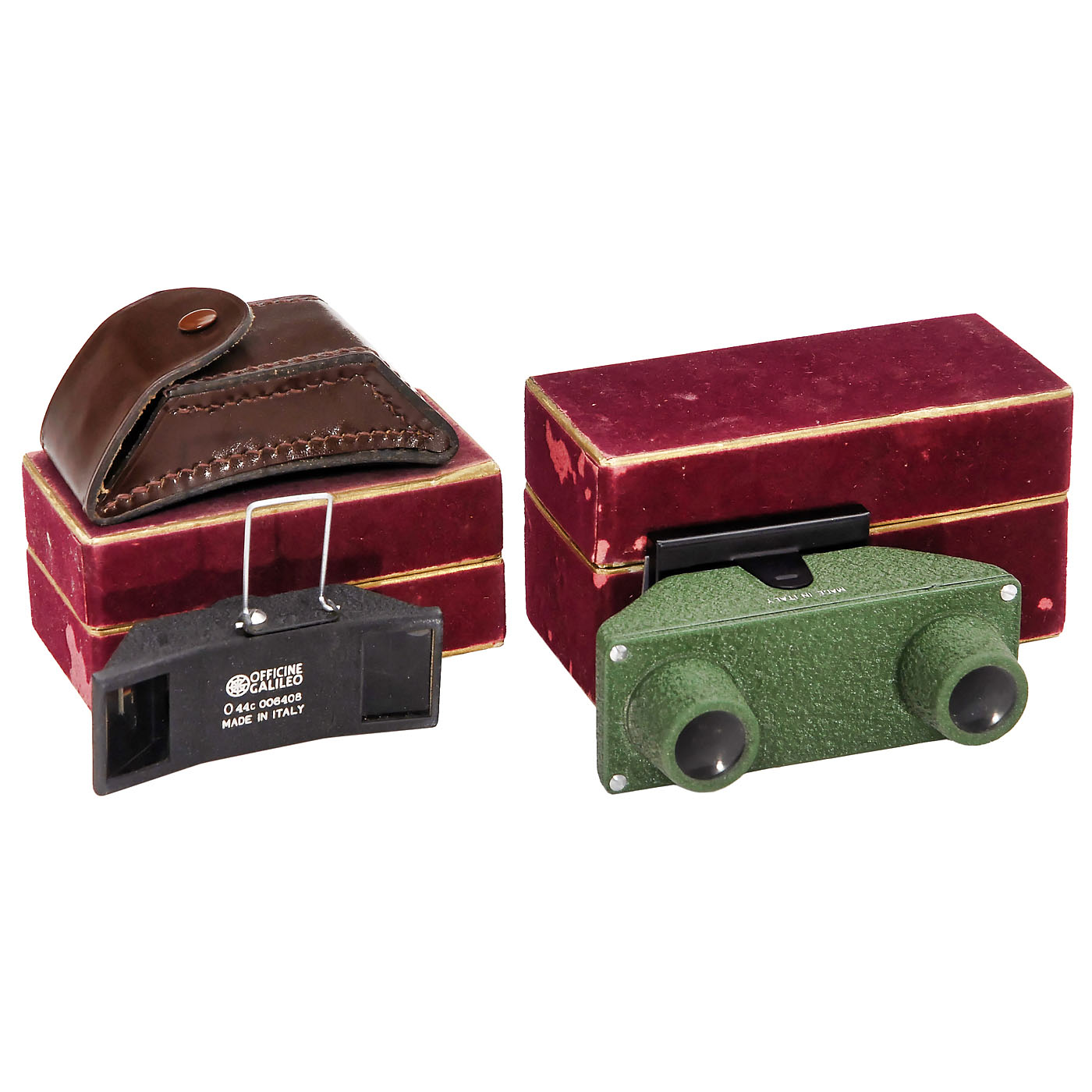 Officine Galileo, Italy. Stereoscopic accessories for the Leica-like Condor camera by Galileo. 1) Prism stereo attachment, good condition, with instruction manual, leather case and red velvet box. (2/2) - And: 2) Stereo viewer, inner mirror spotty, otherwise excellent, in red velvet box. (3/-)