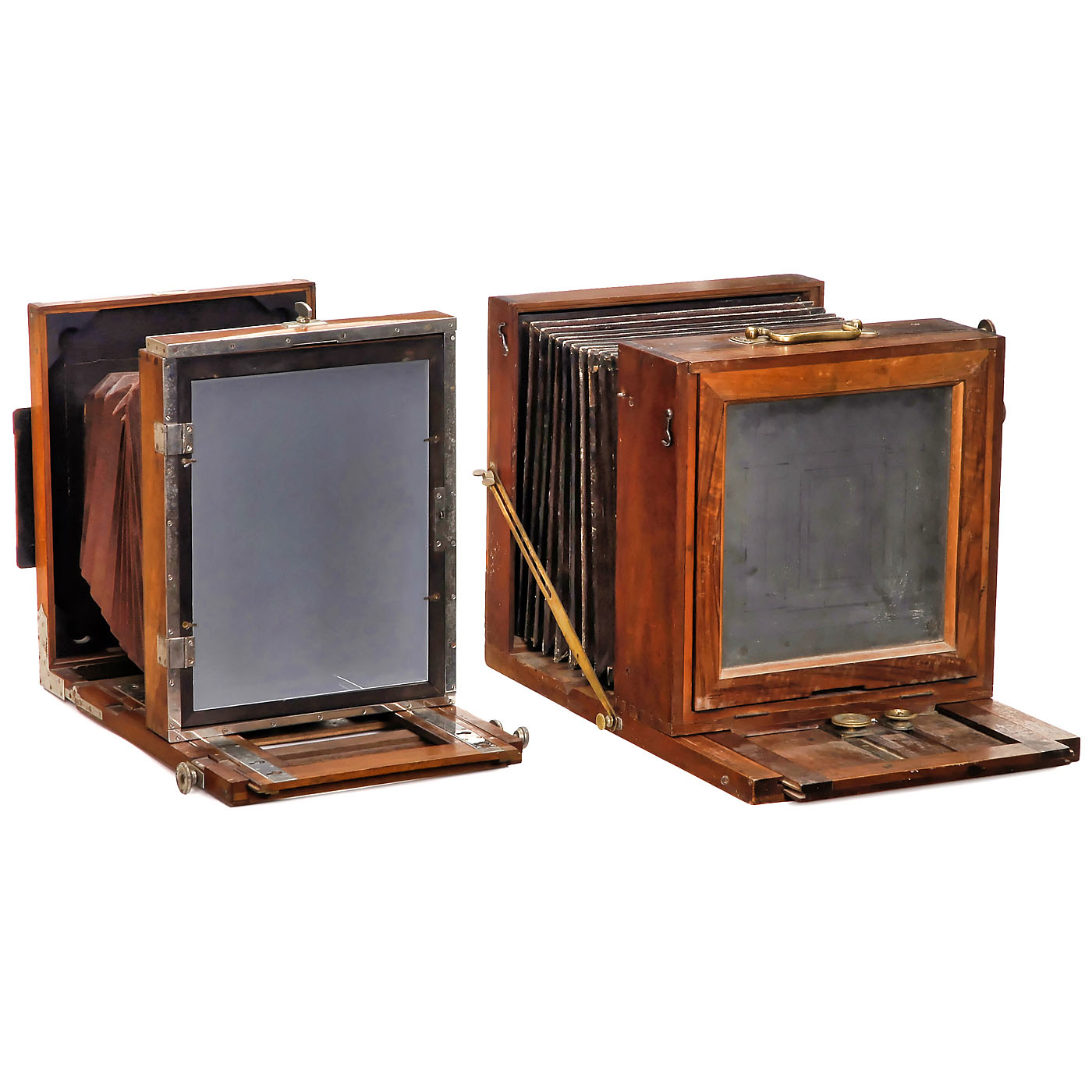 1) Derogy, Paris. No. 21972, Aplanat type approx. 8/33 cm, glass clean, with one Waterhouse stop. (3/3) - 2) Mackenstein field camera, Paris, 21 x 27 cm, walnut body with nickel-plated fittings, slide-in back, double extension, brown leather bellows, shutter (working), ground-glass screen with unusual flap and slide-in section for darkslides, with three darkslides with working blinds (function unclear), two sections broken off camera base and standard, 90° movement of bellows sticking. (3-/-) - And: 3) Collodion camera, 24 x 24 cm, extension of up to 70 cm, bracing via side struts only, with ground-glass back, camera: 34 x 36 x 52 cm, bellows in good condition, some wormholes in wood. A very early construction. (3-4/3-)