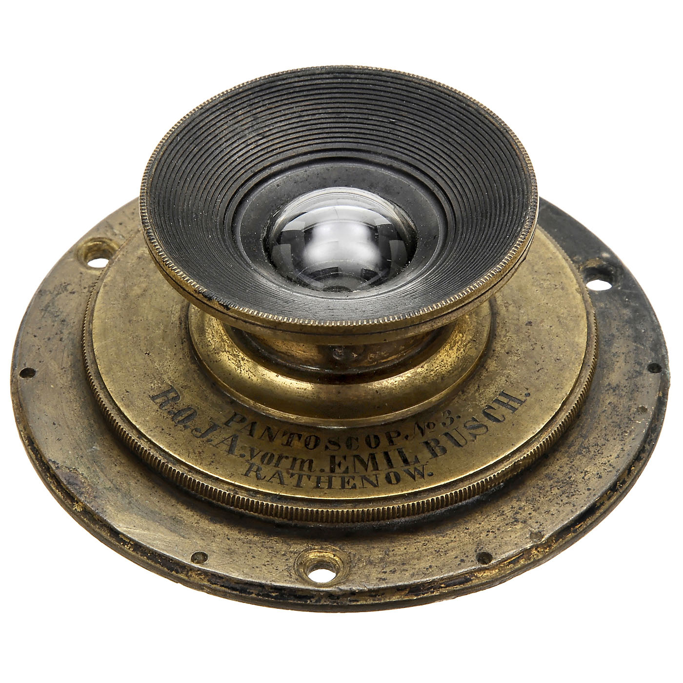 R.O.J.A. vorm. Emil Busch, Rathenow. Wide-angle lens with approx. 22/12 cm focal length, height of the lens 1 ⅖ in., sunshade front lens Ø 1 ½ in., front element with minor lens separation in one corner - insignificant for practical work with right-angled format. Glass very clean, with connecting ring, waterhouse stop replaced. - Emil Busch recounted how he found the optimal lens form by grinding more and more curved achromatic lenses. The Pantoscop was the only anastigmatic wide-angle on the world market before the development of new glass types enabled the calculation of anastigmat lenses.