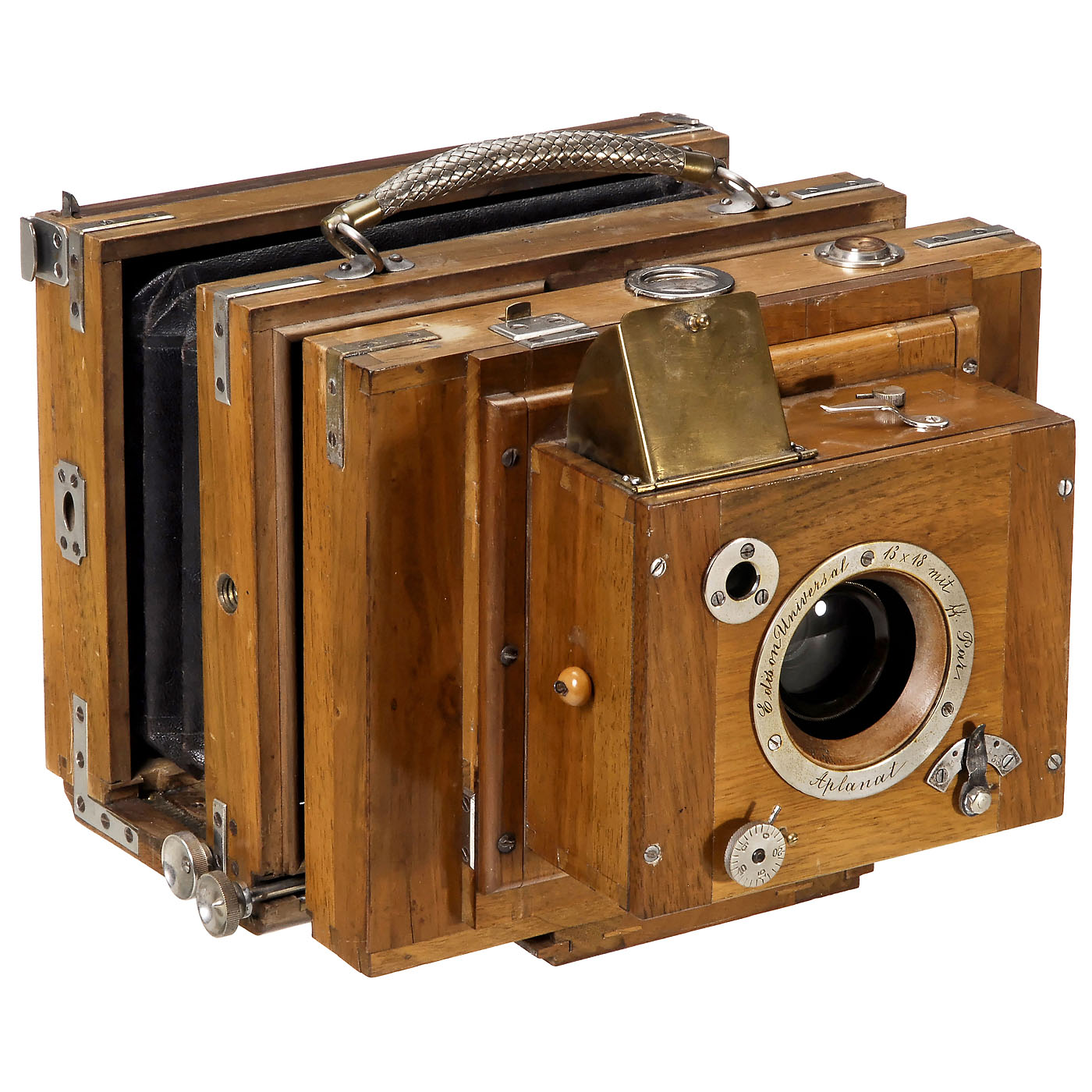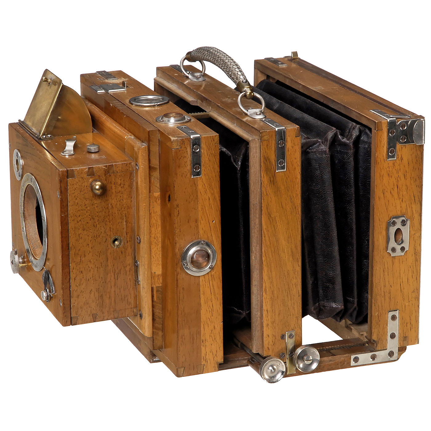 Ernemann, Dresden. No. 8405, for 13 x 18 cm, with rotatable shutter and lens unit "Edison Universal 13 x 18 ff Par. Aplanat" (Par. = Parisian), rack and pinion with built-in Edison distance meter, focusing screen back and original braided steel grip, shutter working, first baseboard works well, second baseboard somewhat difficult due to removal of the later-added stabilisers, strip of wood replaced. Extremely rare and very early Ernemann in attractive condition.