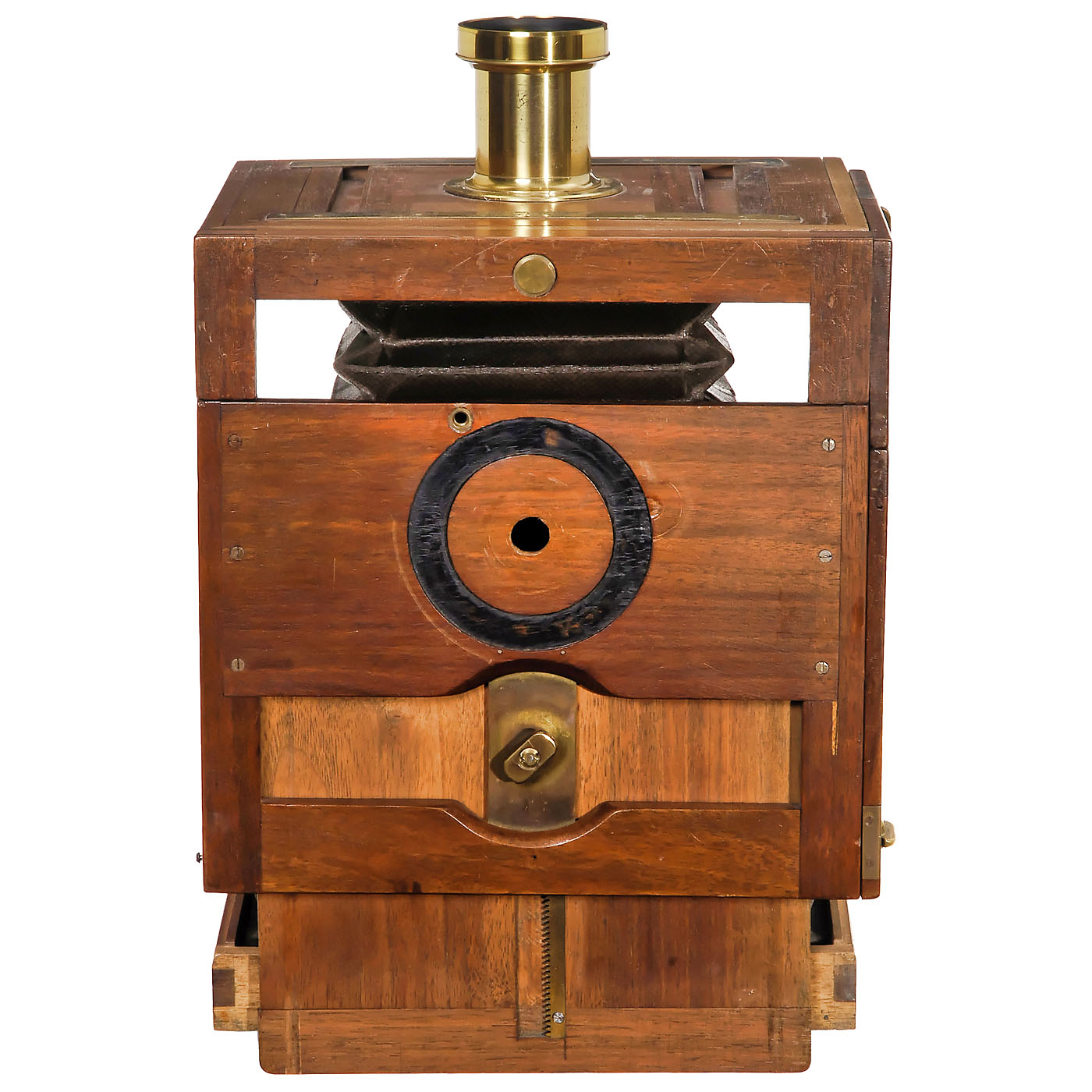 Jonte, Paris. Well-constructed professional camera, 13 x 18 cm, tailboard with two levers for rotating the front plate on its horizontal axis and inclining the back on its baseplate, the focusing mechanism located (unusually) on the underside, with dark-brown bellows, bush for tripod-head, changeable lens board with brass-bound Jonte lens, slide-in back for horizontal and vertical fronts and hinged focusing screen, in good overall condition. A lightweight and stable camera with an almost contemporary feel, suitable for large-format and Scheimpflug photography.