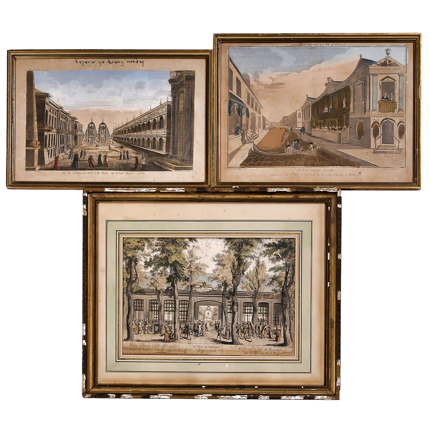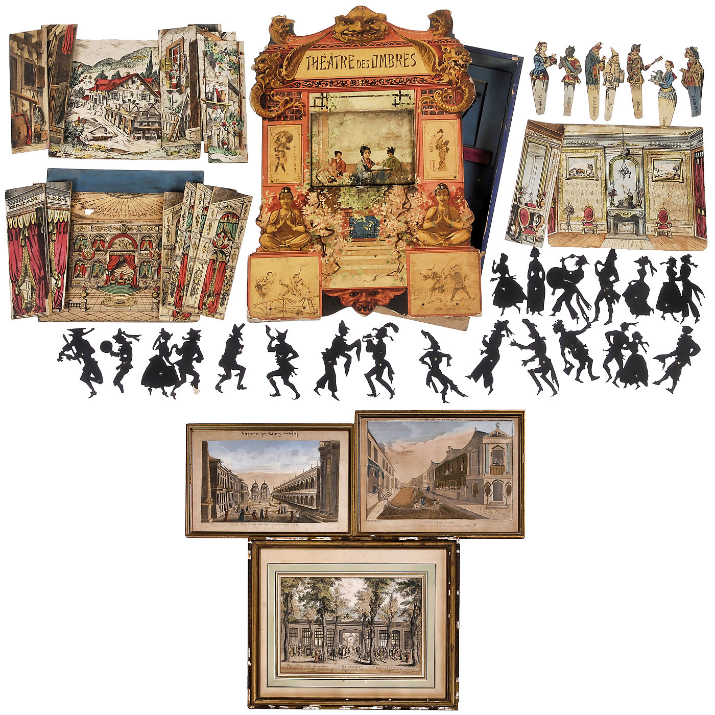 1) Théatre Des Ombres, blue box 24,5 x 35,5 cm, loose proscenium with 4 slots for scenery, 3 sets of scenery (the throne hall, a salon und a mill), 13 wings, 7 colored and 19 shadow figures (4 damaged), in blue box, 24,5 x 35,5 cm, theatre front/lid 43 x 30 cm, unrestored. (4/4) - 2-4) "35.e Vue d’Optique representant Le Grand Caffe d’Alexandre sur le Boulevards de Paris" 41 x 30 cm, "Vue de la Place de Dely et du Palais du Grand Mogul 1760" 43 x 27 cm and "35 Vue d’Optique Nouvelle Representant la G. Rue et le Canal des Etrangers à Leyden en Hollande" 43 x 32 cm. Unframed dimensions. (3-/-)