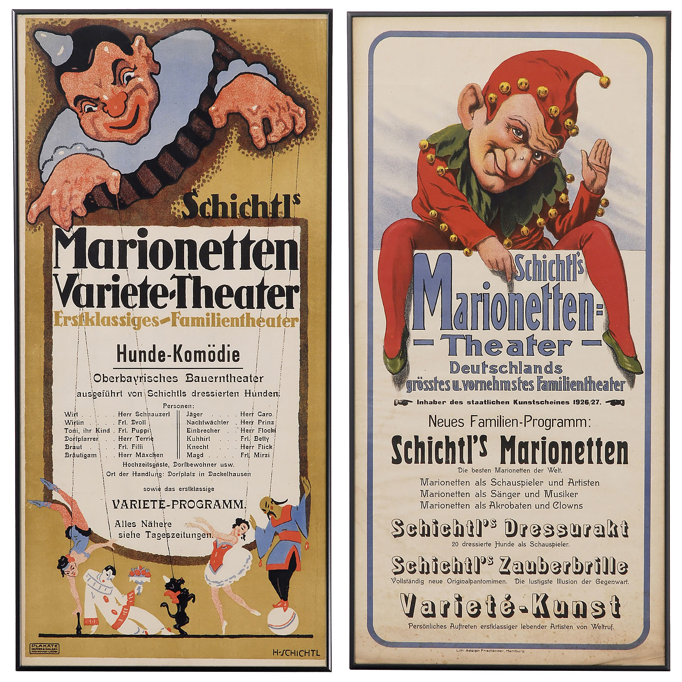 1) Color lithograph by Dopfer and Walsen, Hannover. Poster for a "canine comedy" ("Hunde-Komödie"), showing a clown with dancing puppets, dimensions with frame 13 ¾ x 28 ¾ in. - And: 2) "Germany's largest and most distinguished family theater", color lithograph by Adolph Friedländer, Hamburg, poster for the new family program, showing a clown pointing to the program, dimensions with frame 13 ¾ x 28 ¾ in.