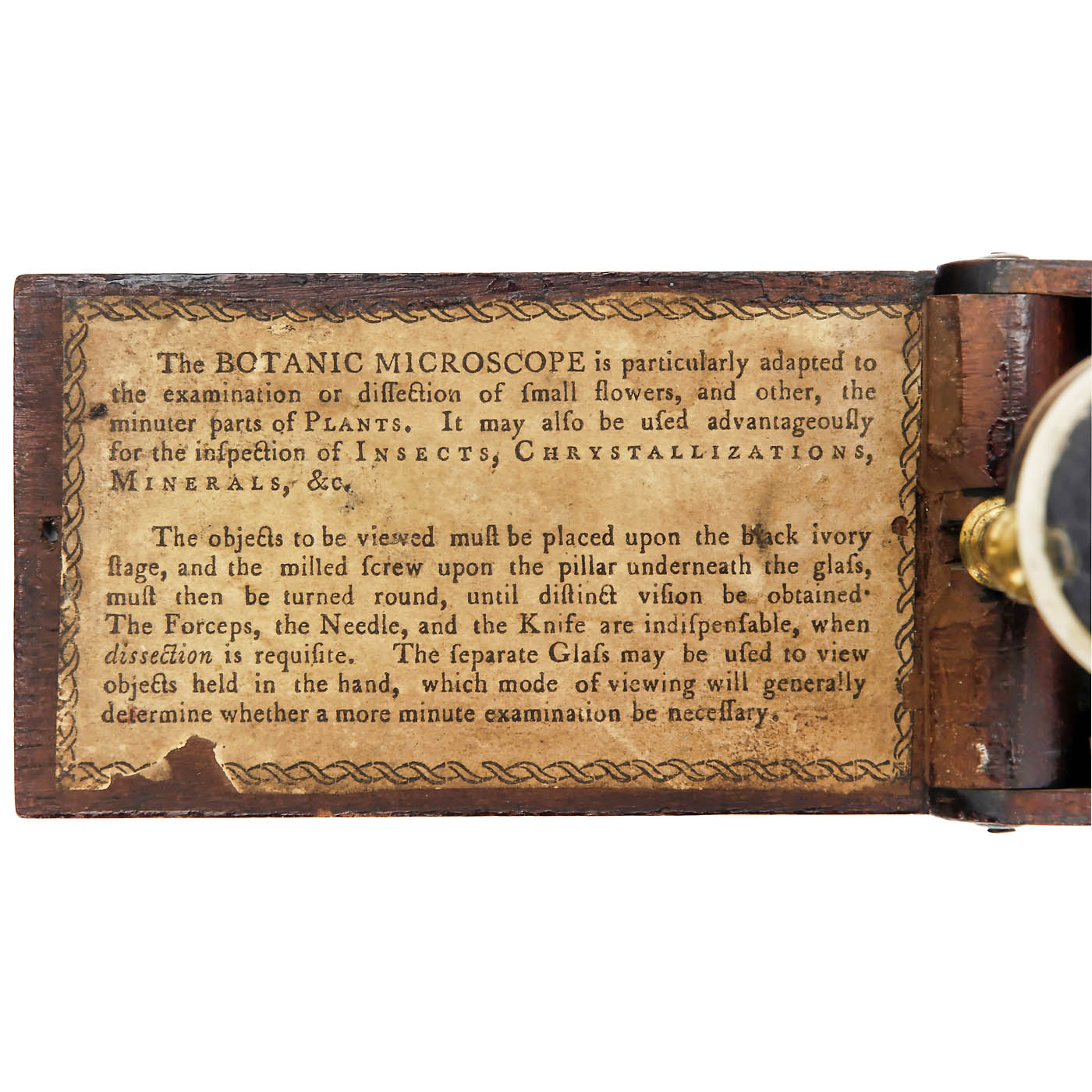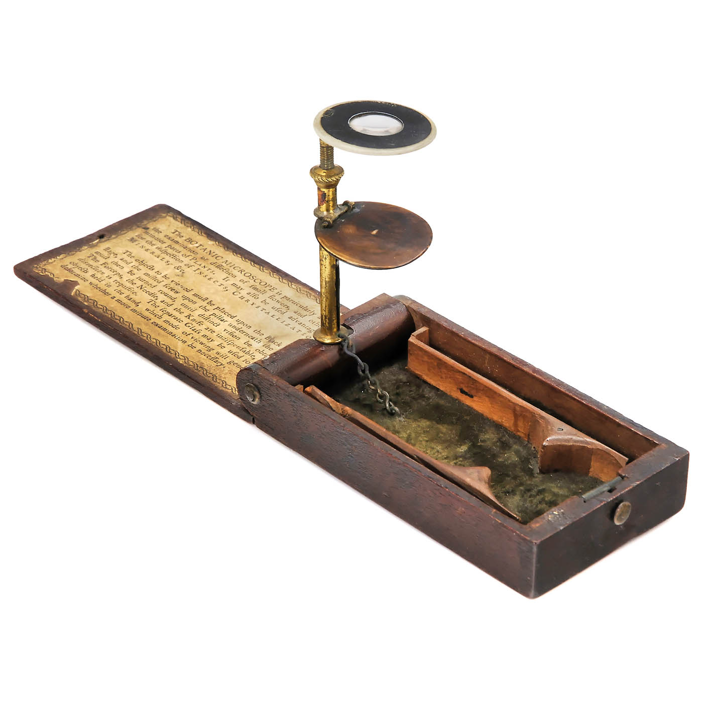 William Withering (1741–1799), British botanist and medical scientist. Small pocket microscope with bone-mounted loupe, foldable mahogany box, size:4 ¾ x 2 1/3 x 1 1/6 in. box inside with brief instructions.