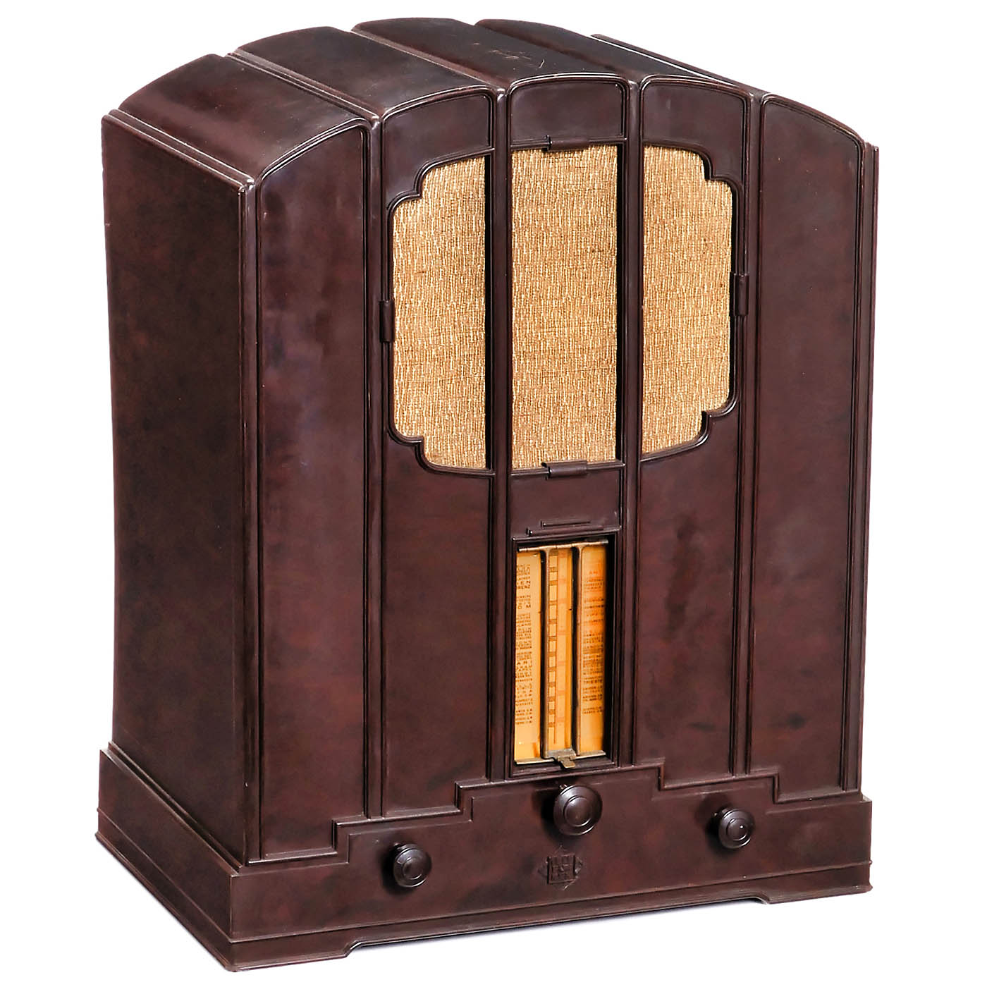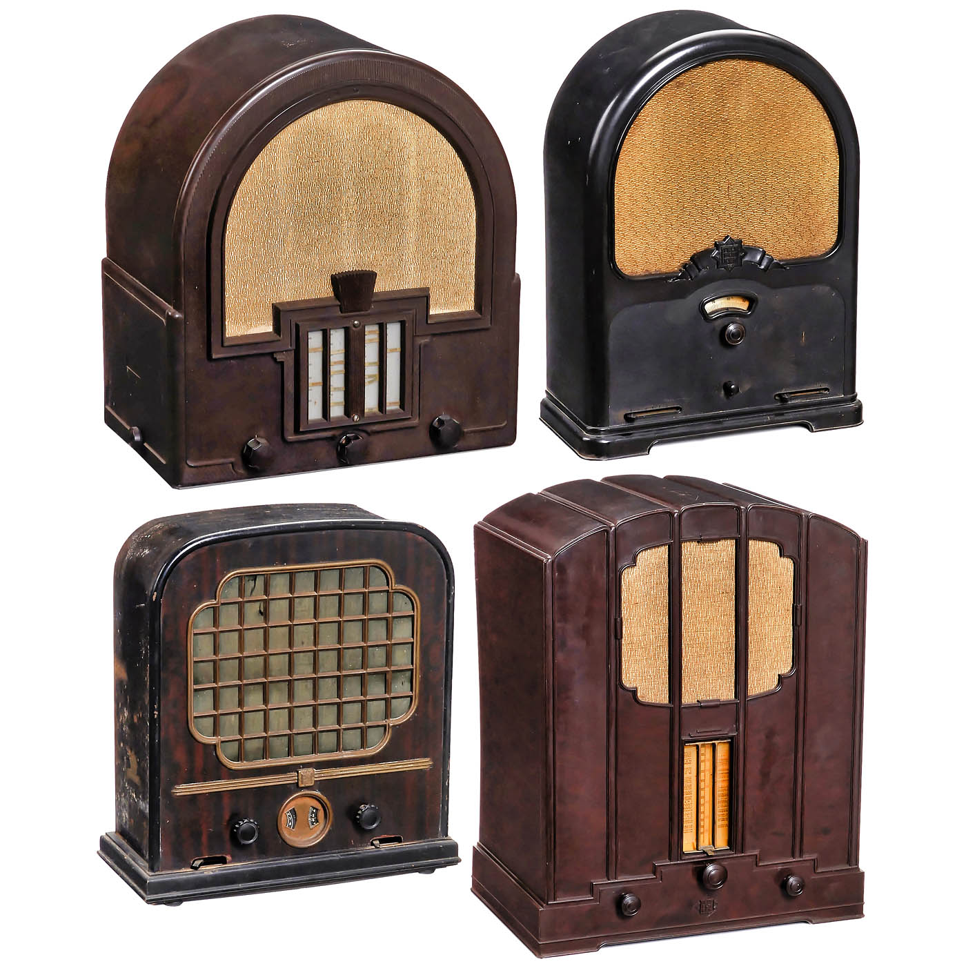1) Model 620, c. 1933, Telefunken Prague, 7 tubes (complete), alternating current, 3 wave ranges, built-in loudspeaker. – 2) Model 344 WL, c. 1932, Telefunken Germany, 5 tubes (missing), alternating current, 2 wave ranges, built-in loudspeaker. – 3) Model 33 GL, c. 1931, Telefunken Germany, 3 tubes (complete), direct current, 2 wave ranges, built-in loudspeaker. – And: 4) Model 250, c. 1932, Telefunken Vienna, 3 tubes (complete), alternating current, medium wave only, built-in loudspeaker. – All cabinets in good condition, with rear panels.