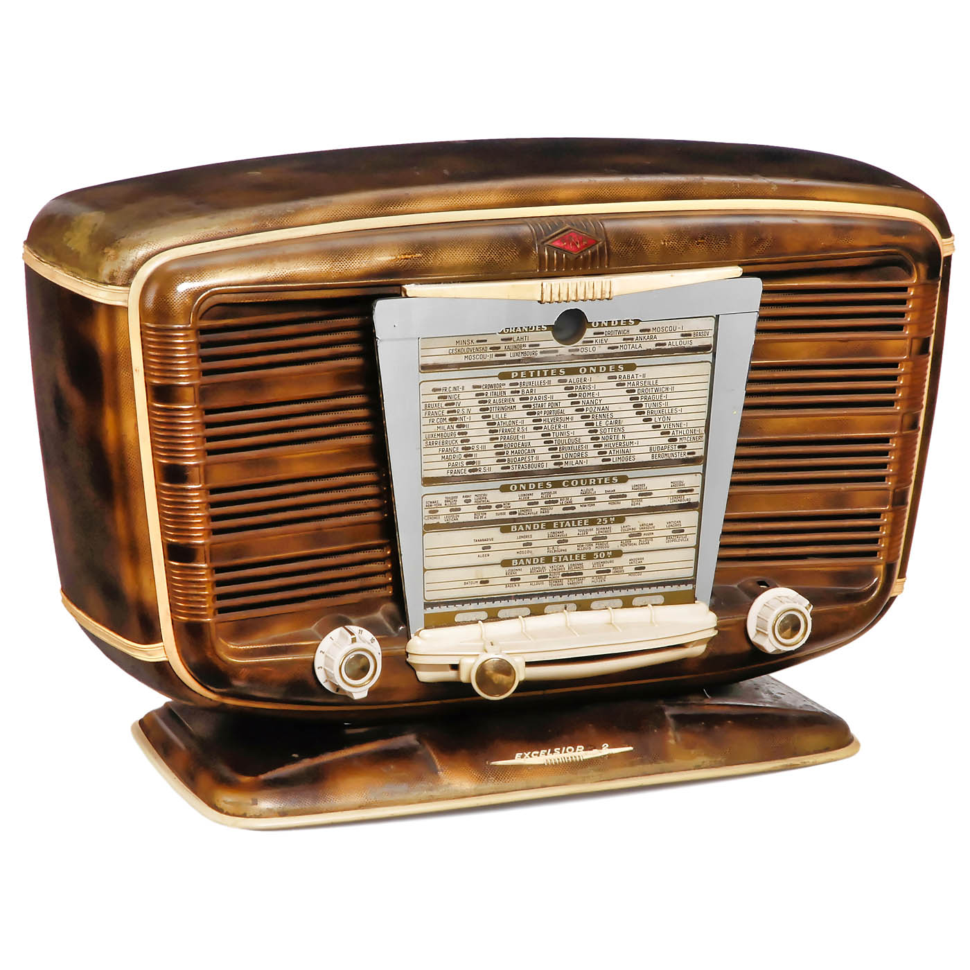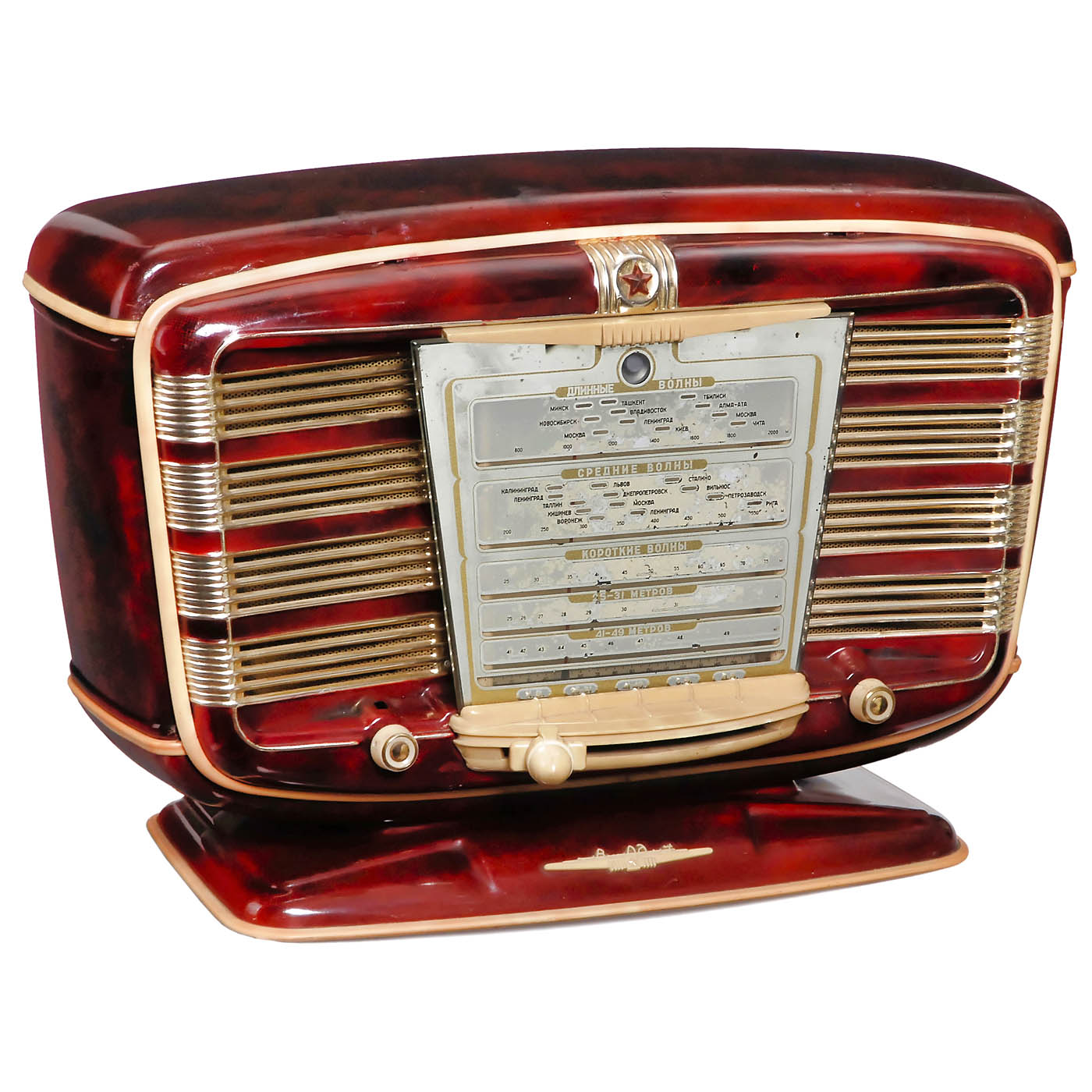 1) Radio SNR model Excelsior 52, 1950s, by S.N.R., Paris. 6 valves, 3 wave ranges, mains-powered, 2 in-built loudspeakers, metal case, scale slightly repaired, a very sought-after design radio. – And: 2) Zvezda 54 "Red Star" radio, 1954, Moscow, Russian 7-tube radio receiver, LW, broadcast and several SWs, 2 loudspeakers, metal case, red paint with gilt highlights, scale slightly faded. Based on the French SNR Excelsior 52 radio.