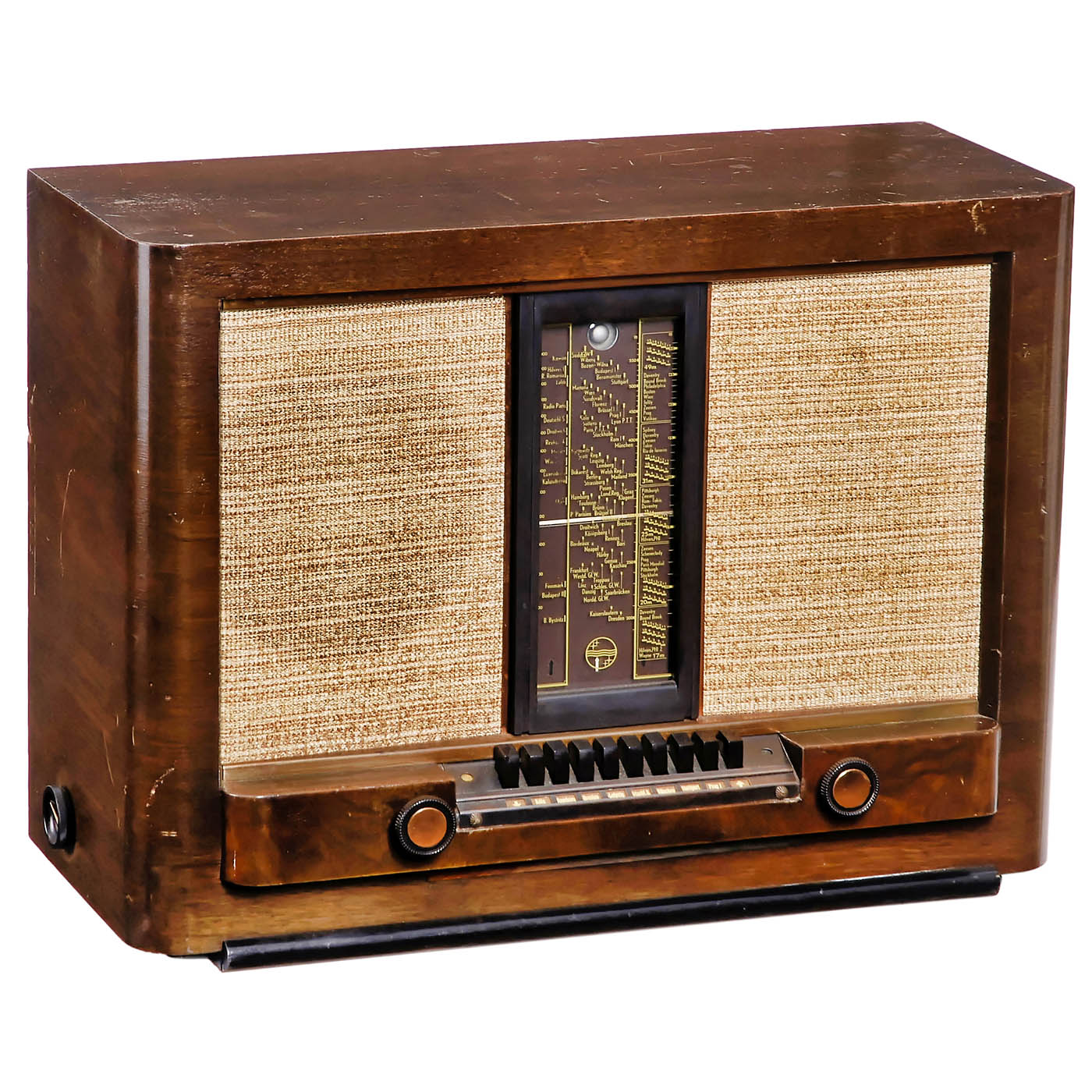 All units with wood cases, mains operation and built-in loudspeakers, rear panels missing. 1) Tefifon 541, c. 1955, with built-in HS19 tape player. – 2) Philips Aachen Super D63, c. 1940, with motorized selector. – 3) Telefunken D750WK, c. 1940. – And: 4) Unknown model, probably France.