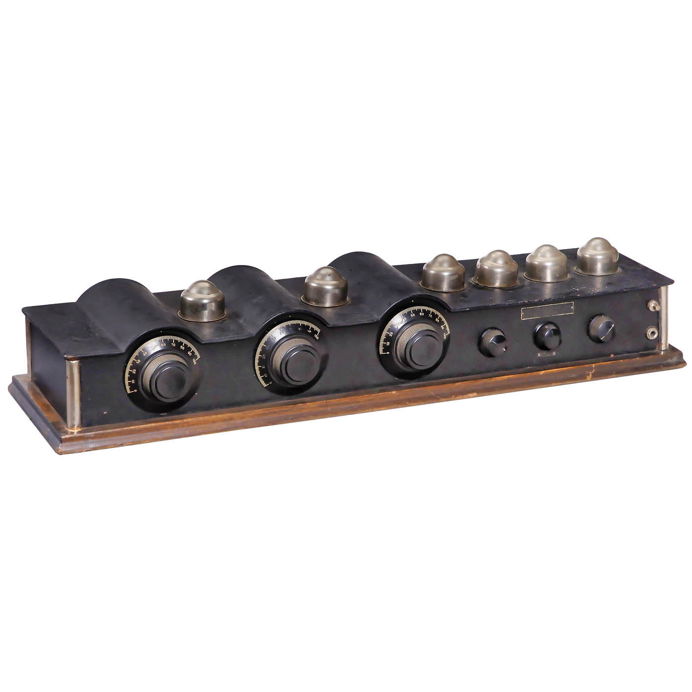 Manufactured by Neutrowound Radio Mfg. Co., USA. 6 valves, battery, for loudspeaker, metal case, original paint, label on front, wood base, width 34 in., original mounts.