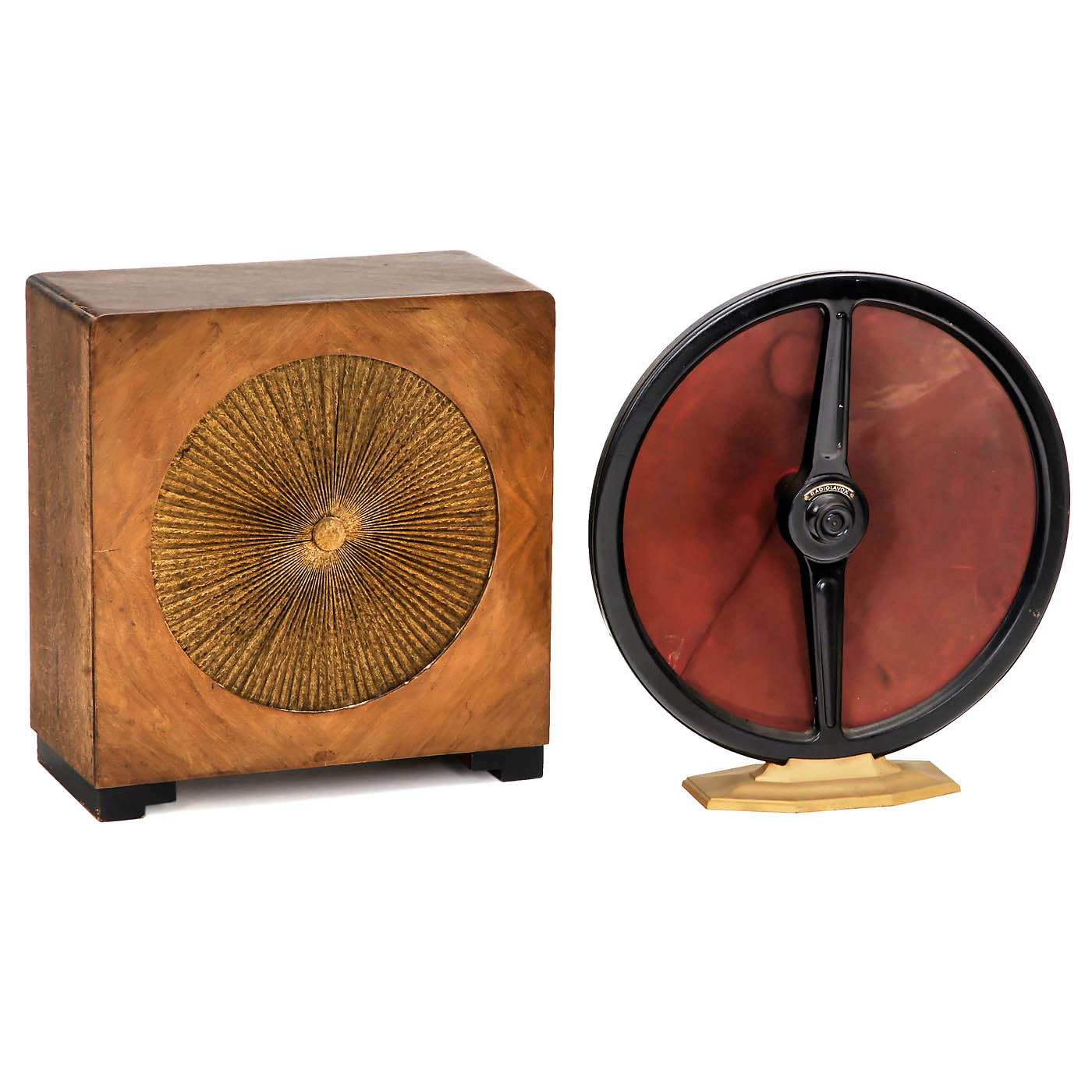 1) Pival, France, c. 1927, horn loudspeaker, 500 ohms, bakelite base, large metal horn, Ø 13 ¾ in. – 2) Radiola 100-A, RCA, USA, c. 1927, magnetic system, metal case. – 3) Elmi Regent, M. Weißenberg, Vienna, c. 1929, bakelite case, Ø 12 ¼ in. – 4) Hesofon, Patent-Elementebau, Germany, c. 1930, magnetic system, wood case. – 5) Horn loudspeaker, unmarked, c. 1927, Ø 14 in. – And: 6) Radiolavox, c. 1928, SFER, France, magnetic system, metal frame.