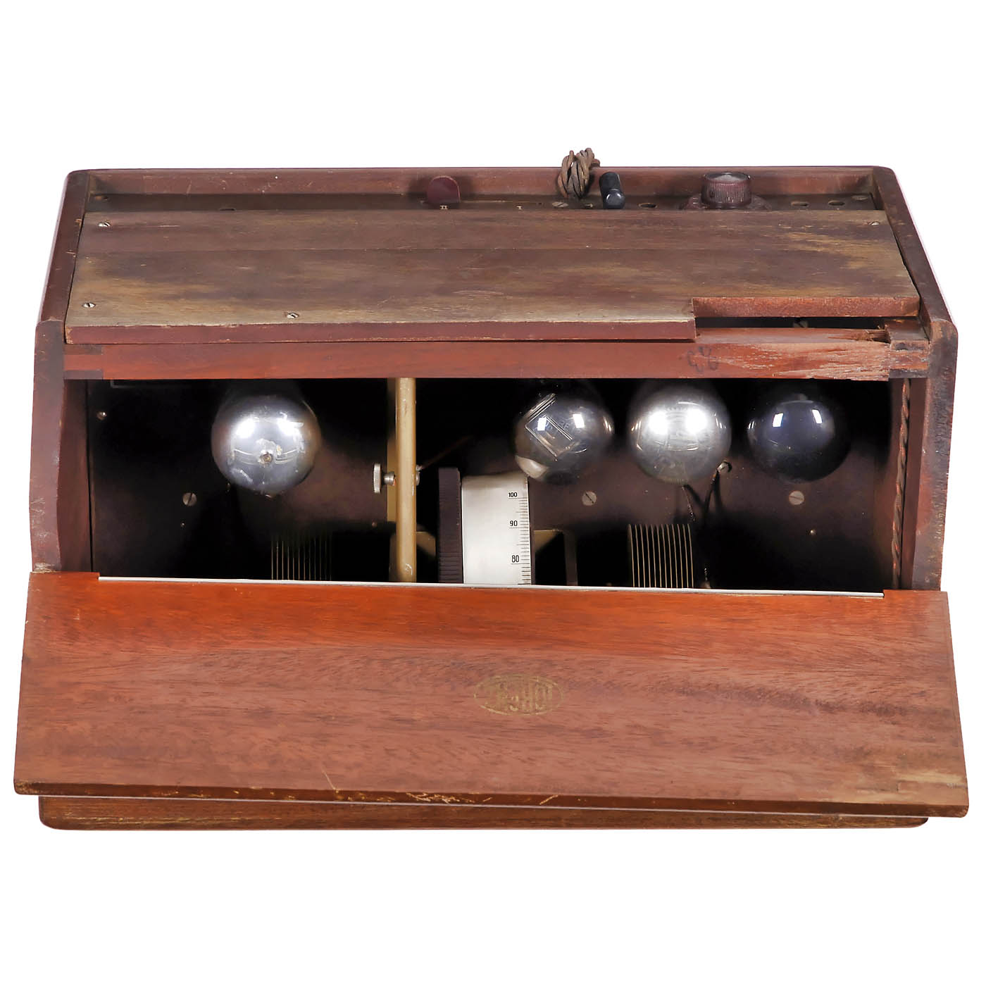 1) Weltecho ERWW 428, c. 1929, Lorenz, Berlin, medium wave and long wave, 4 tubes, battery-operated, mahogany case, for external speaker. – 2) Siemens 26 WLK, c. 1934, 3 tubes, 110–240 volts AC, dynamic loudspeaker, wood case. – 3) Merkur SOQ, c. 1929, Schneider-Opel, Frankfurt, 3 tubes (missing), long wave and medium wave, battery-operated, for headphones or low-frequency amplifier, wood case. – And: 4) Blaupunkt LW300, c. 1930, Ideal-Werke, Berlin, 4 tubes, 125–240 volts AC, magnetic loudspeaker, wood case.