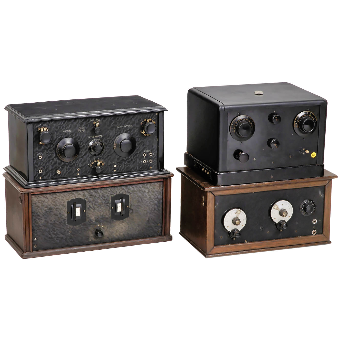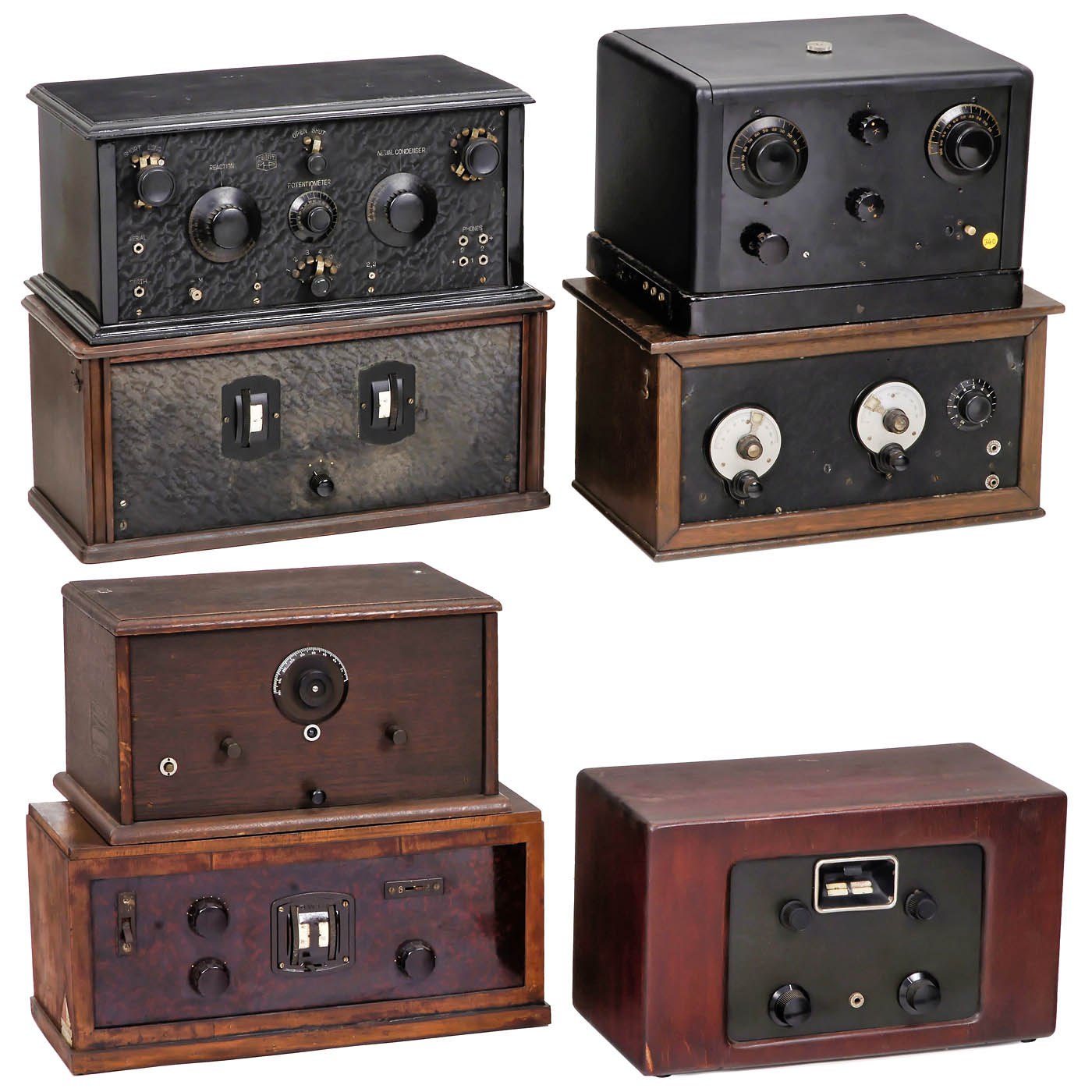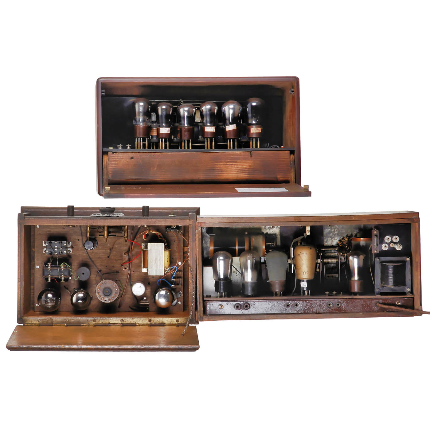 1) Owin E54, c. 1928, 4 tubes, battery operation, long wave and medium wave, for external speaker, incomplete, wood case. – 2) Kit radio, c. 1928, Germany, 3 tubes (Telefunken RE034 and 2 x RE134), battery operation, for external speaker, wood case, with interesting components. – 3) Zenit R.041, c. 1928, Prague, 3 tubes (missing), battery operation, long wave and medium wave, for external speaker, wiring incomplete, wood case. – 4) Unmarked, c. 1932, probably Germany, 4 tubes, mains operation, for external speaker, metal case. – 5) Kit radio, c. 1930, Germany, 6 tubes (Philips A443, 3 x A410N, B424 and B443), battery operation, for external speaker, wood case, with interesting components. – 6) Kit radio, c. 1929, probably Germany, 3 tubes, mains operation, for external speaker, wood case. – And: 7) Owin E22W, c. 1930, 5 tubes, 90–240 volts AC, long wave and medium wave, for external speaker, wood case.