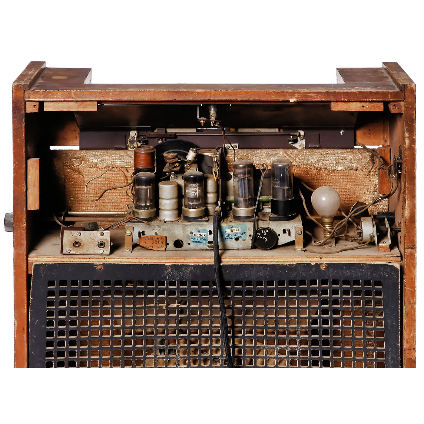 1) Atwater Kent, Model 89, USA, c. 1931, 10 tubes, medium wave only, 110 volts AC, repainted wood case, height 38 ½ in. – And: 2) Waldorp Diamand Series Model 46 AU, N.V. Ned. Instrumentenfabriek, Den Haag, c. 1947, Philips chassis and speakers, 4 tubes, 3 wave ranges, 125/220 volts AC/DC, illuminated front with etched swallows over the terrestrial globe, dial missing cover, missing part of the back panel and a knob, wood case, height 32 in. A rare radio with interesting illumination.