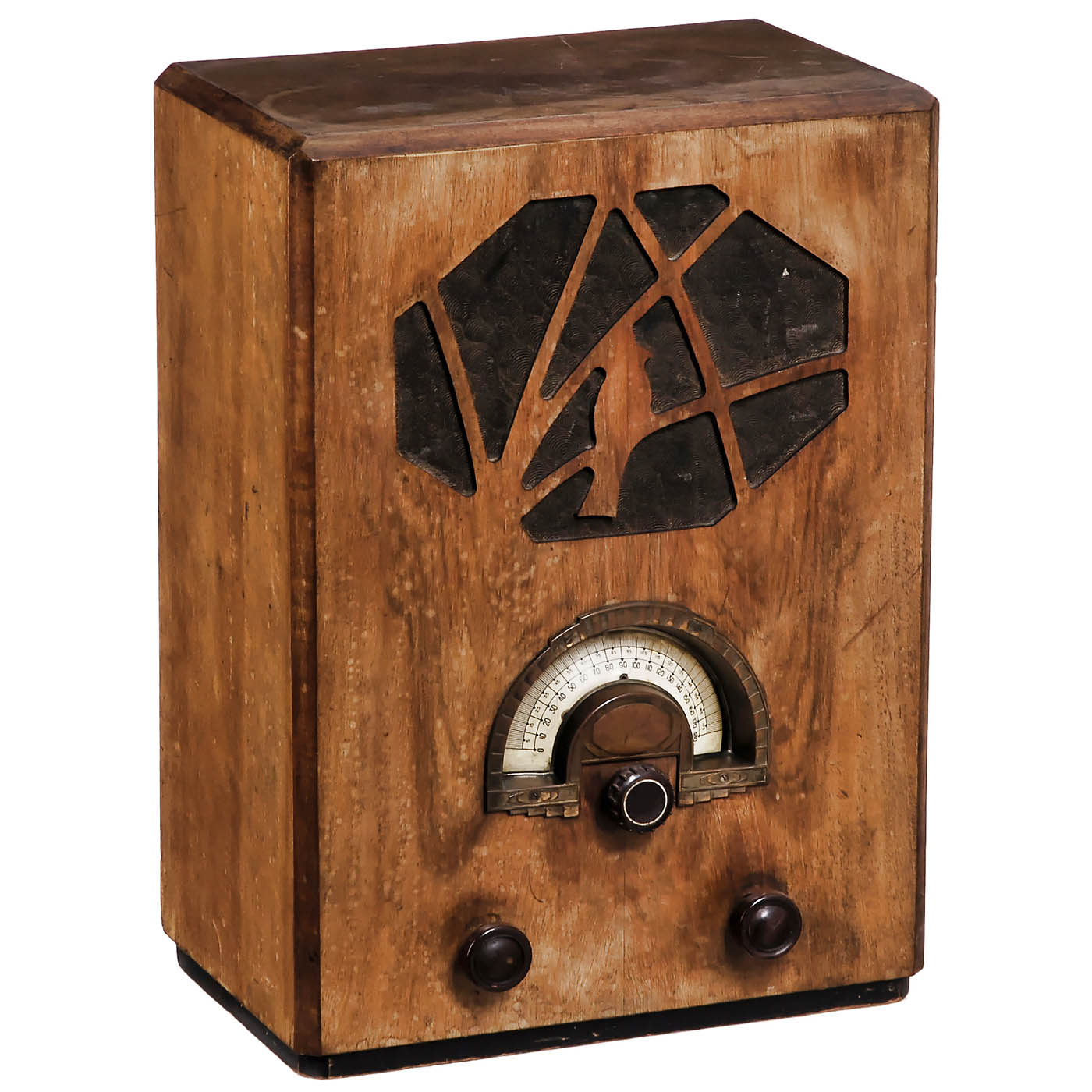 1) Nora W201L, c. 1934, Nora, Berlin, 3 tubes, long wave and medium wave, 110–240 volts AC, dynamic loudspeaker, wood cabinet, with back panel. – 2) Eswe N4, c. 1929, Sachsenwerk, 4 tubes (Telefunken: 2 x RE 074, 1 x RE 084 and 1 x RE 134), long wave and medium wave, battery-operated, for external loudspeaker, black-lacquered wood cabinet. – 3) France, c. 1933, manufacturer and model unknown, 4 tubes, mains operation, with loudspeaker, wood cabinet without rear panel. – And: 4) Saba 31W, c. 1931, 4 tubes, long wave and medium wave, 110–220 volts AC, for external loudspeaker, bakelite case.
