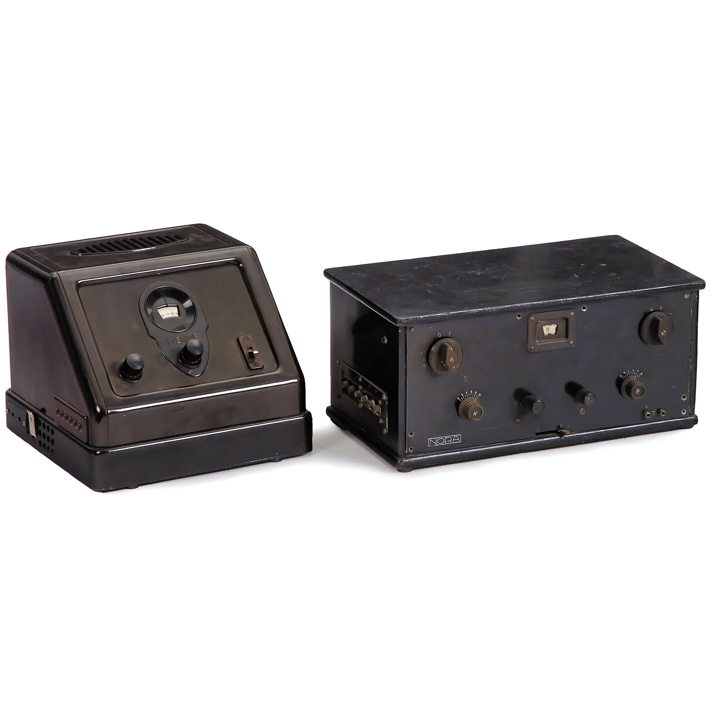 1) Ordensmeister 329G, c. 1931, Lorenz, Berlin, 3 tubes, long wave and medium wave, 110/220 volts DC, for external loudspeaker, metal case. – 2) Neutrodyne P4a, c. 1927, Nora, Berlin, 3 tubes (missing), transformer loose, long wave and medium wave, battery-operated, for external loudspeaker, wood case. – 3) Model 31W, c. 1930, Telefunken Germany, 4 tubes (2 missing), 105–220 volts AC, long wave and medium wave, for external speaker, metal case. – And: 4) Mende E38N, c. 1930, System Günther, Radio H. Mende & Co, Dresden, 4 tubes, long wave and medium wave, 110–220 volts AC, for external loudspeaker, bakelite case.