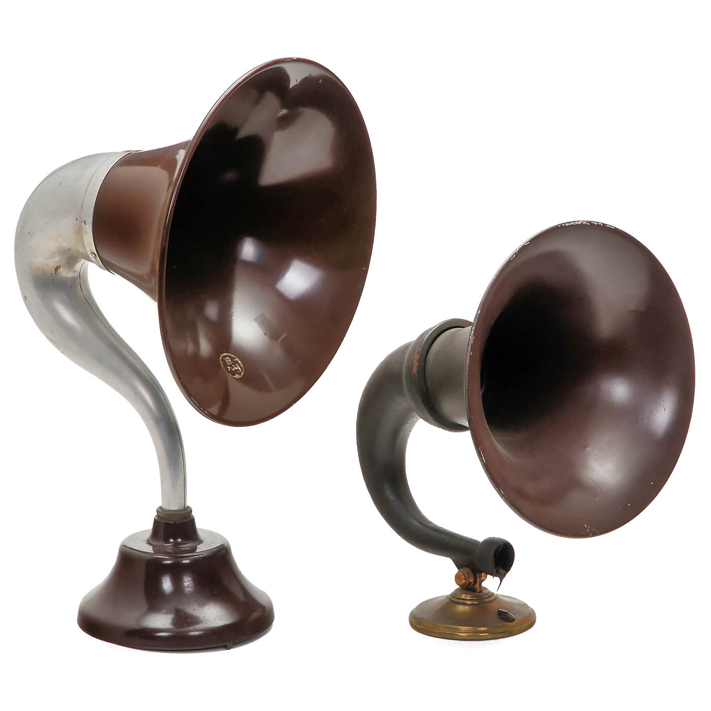 1) B.T.H., Type C3, British Thomson-Houston Co, Ltd, c. 1927, horn loudspeaker, bakelite base damaged, large metal horn, Ø 13 ¾ in. – 2) Lenzona, Lenzen & Röttges, c. 1929, Krefeld, Germany, snail horn loudspeaker in round metal case, Ø 11 ¾ in. – 3) England, British Patent 240972, c. 1927, snail horn loudspeaker, wood case, width 16 ½ in. – 4) Horn speaker, probably England, c. 1926, metal, Ø 11 ¾ in, without speaker system. – 5) Philips model 2003, Eindhoven, c. 1930, bakelite, Ø 14 1/5 in., magnetic system. – And: 6) Electrophon, Stockholm, c. 1930, with plaque "Licens III", 3-tube receiver, battery-operated, wood case, built-in magnetic speaker.