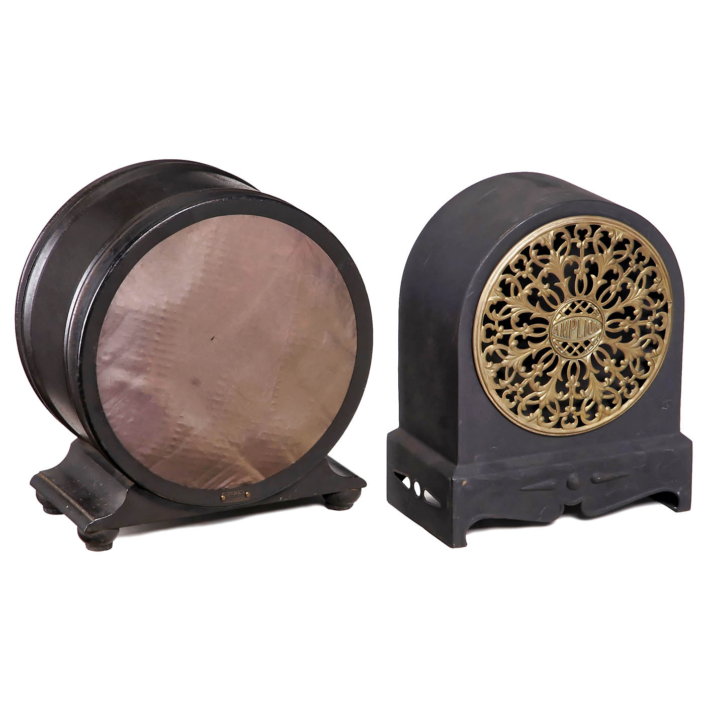 1) Unmarked, probably England, c. 1927, horn loudspeaker, metal, Ø 9 ⅞ in., 2000 ohms. – 2) Lenzona, Lenzen & Röttges, c. 1929, Krefeld, Germany, helical horn loudspeaker in round metal case, Ø 11 ¾ in. – 3) Mende L46, c. 1935, bakelite, width 19 ⅓ in. – 4) Unmarked, England, c. 1927, horn speaker, metal, Ø 9 ¾ in. – And: 5) Amplion Radiolux, Alfred Graham & Co., London, c. 1927, metal, without speaker system, height 13 ⅓ in.