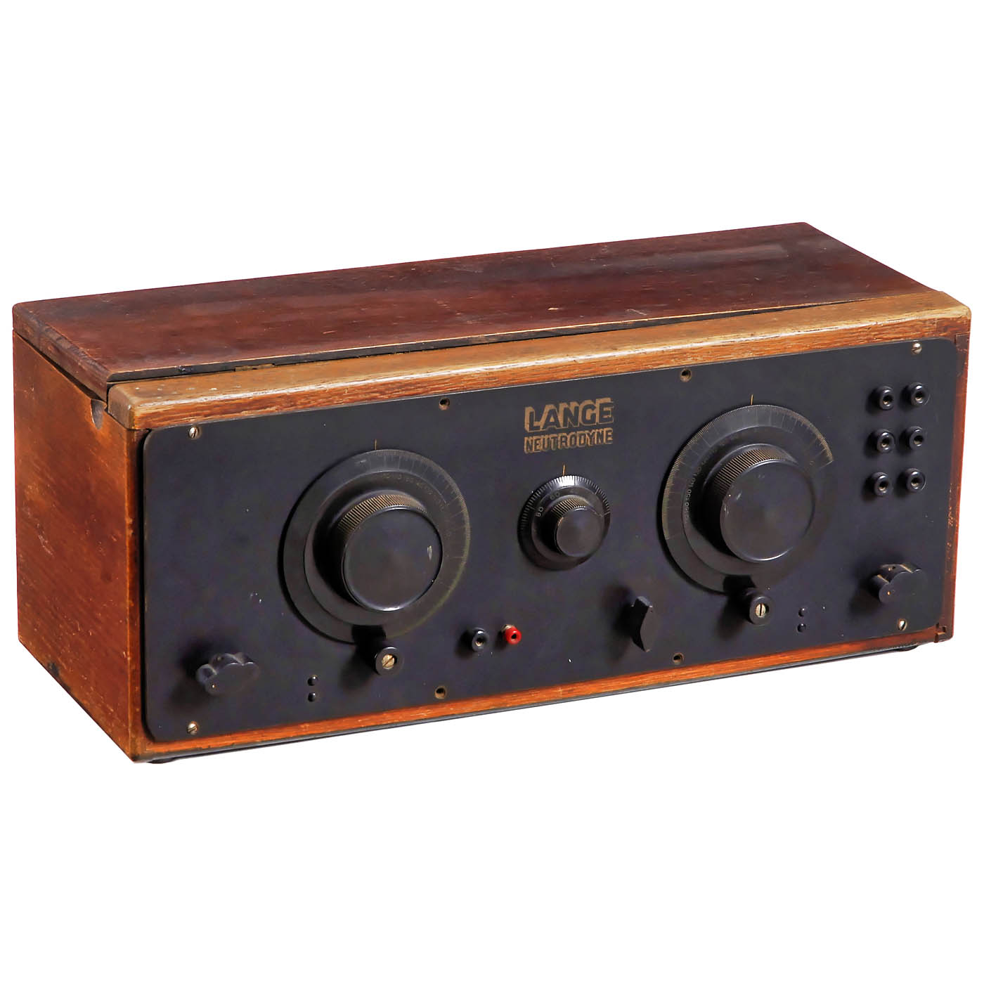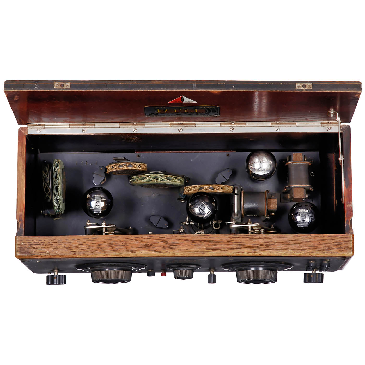 1) Lange L21, Voigtländische Radio-Gesellschaft, 4 tubes (Re074, Re034, R3084 and Re134), long wave, medium wave and short wave, battery-operated, for external loudspeaker, walnut case with lid. – 2) Owin E23W, 4 tubes, long wave and medium wave, 90–240 volts AC, for external speaker, wood case. – 3) Nora S3W, 4 tubes, long wave and medium wave, 110–240 volts AC, for external speaker, bakelite case (back damaged). – And: 4) Rfe27, Siemens & Halske, 4 tubes (2 missing), long wave and medium wave, 220 volts AC, for external speaker, oak case with lid.